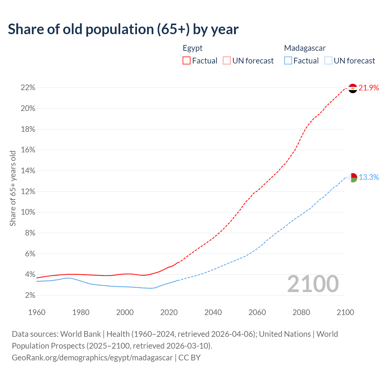 The share of older people aged 65 and over is 5.12% in Egypt and 3.41% in Madagascar. Life expectancy in Egypt compared to Madagascar .