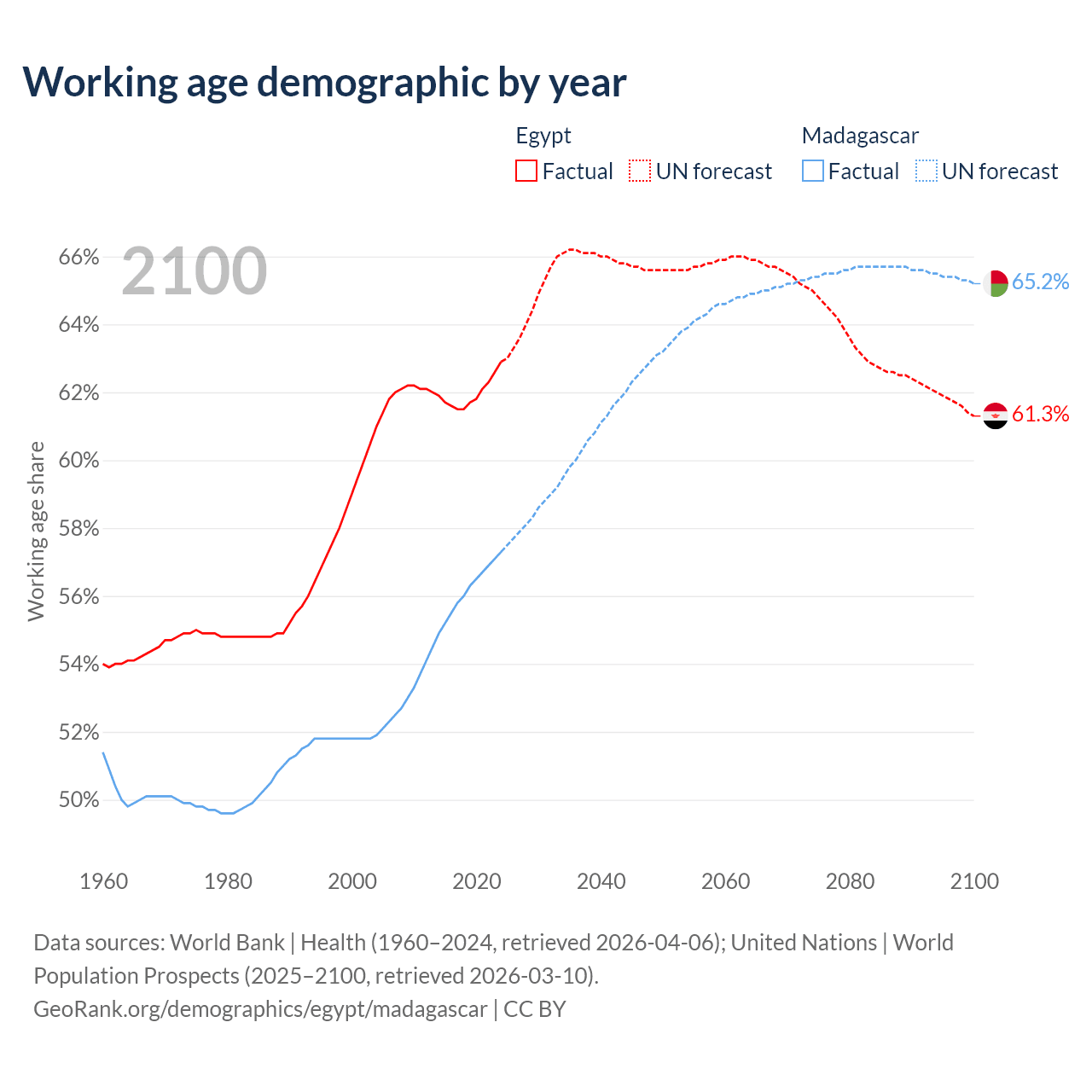 - Egypt has 75.9M working age adults (aged 15-64) vs 19.4M in Madagascar.