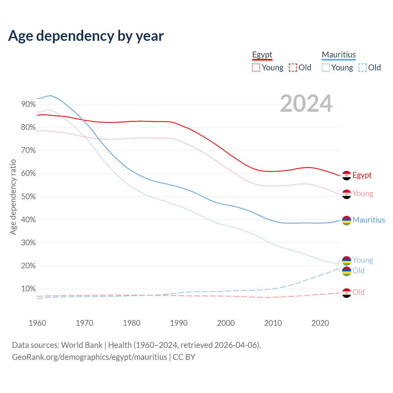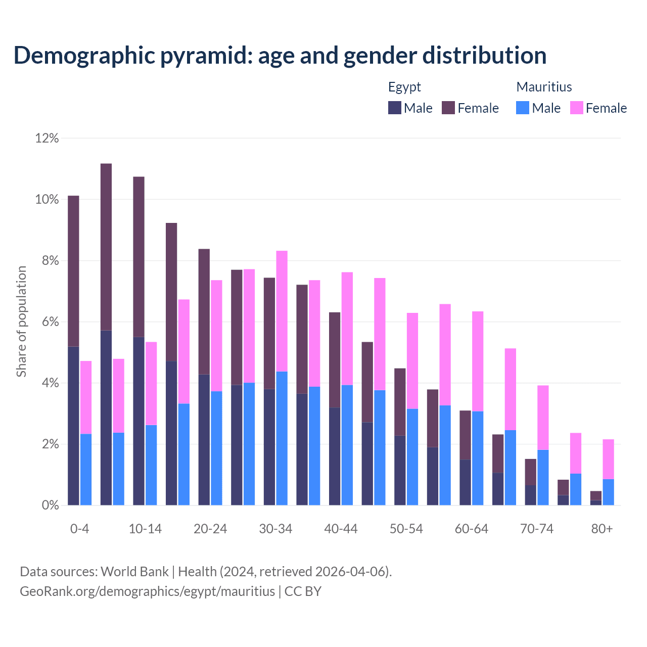 The share of older people aged 65 and over is 5.12% in Egypt and 13.5% in Mauritius. Life expectancy in Egypt compared to Mauritius .