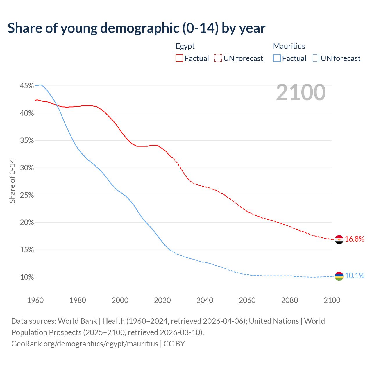 - The share of young demographic (0-15 years old) in Egypt is 32% vs 14.8% in Mauritius.