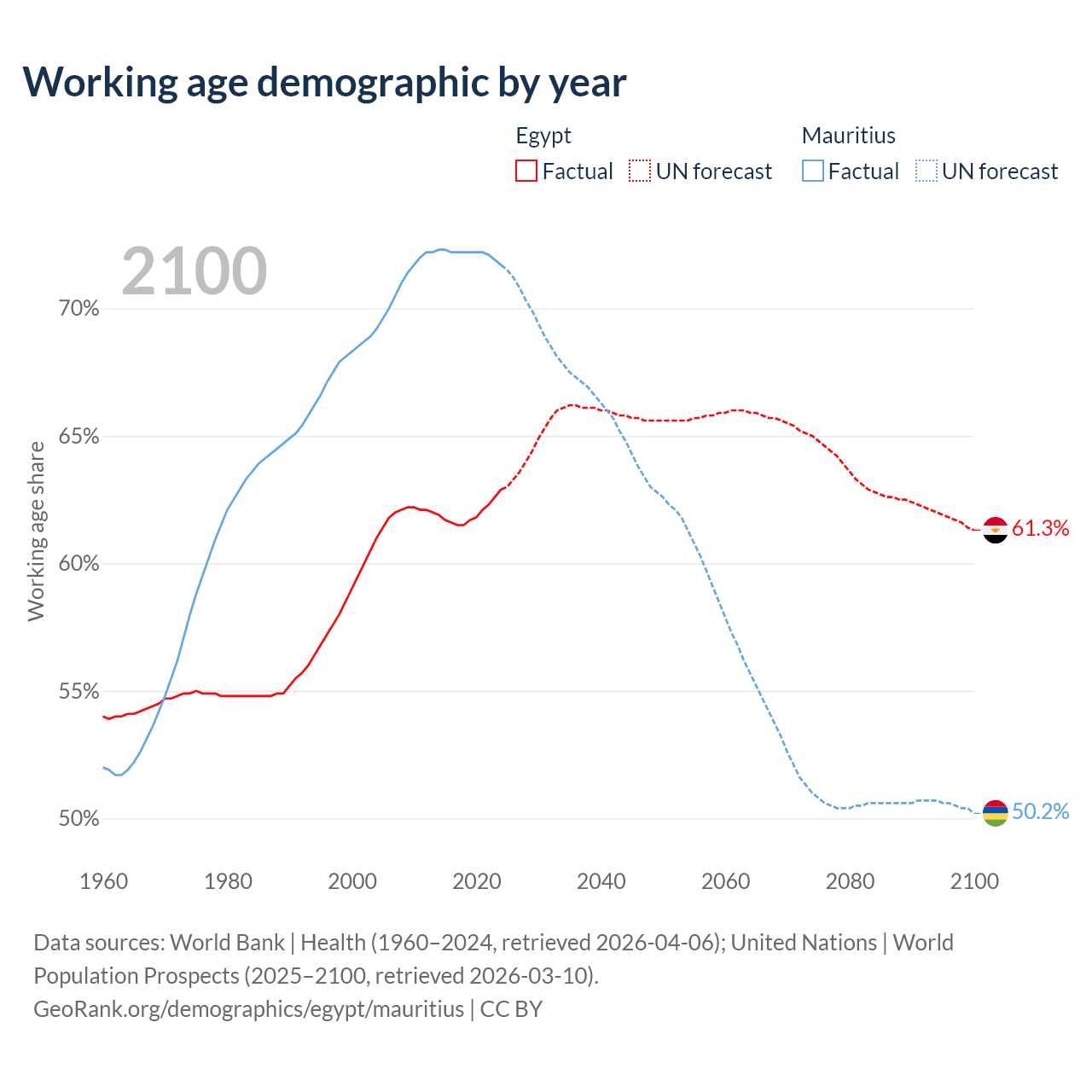 - Egypt has 75.9M working age adults (aged 15-64) vs 889K in Mauritius.