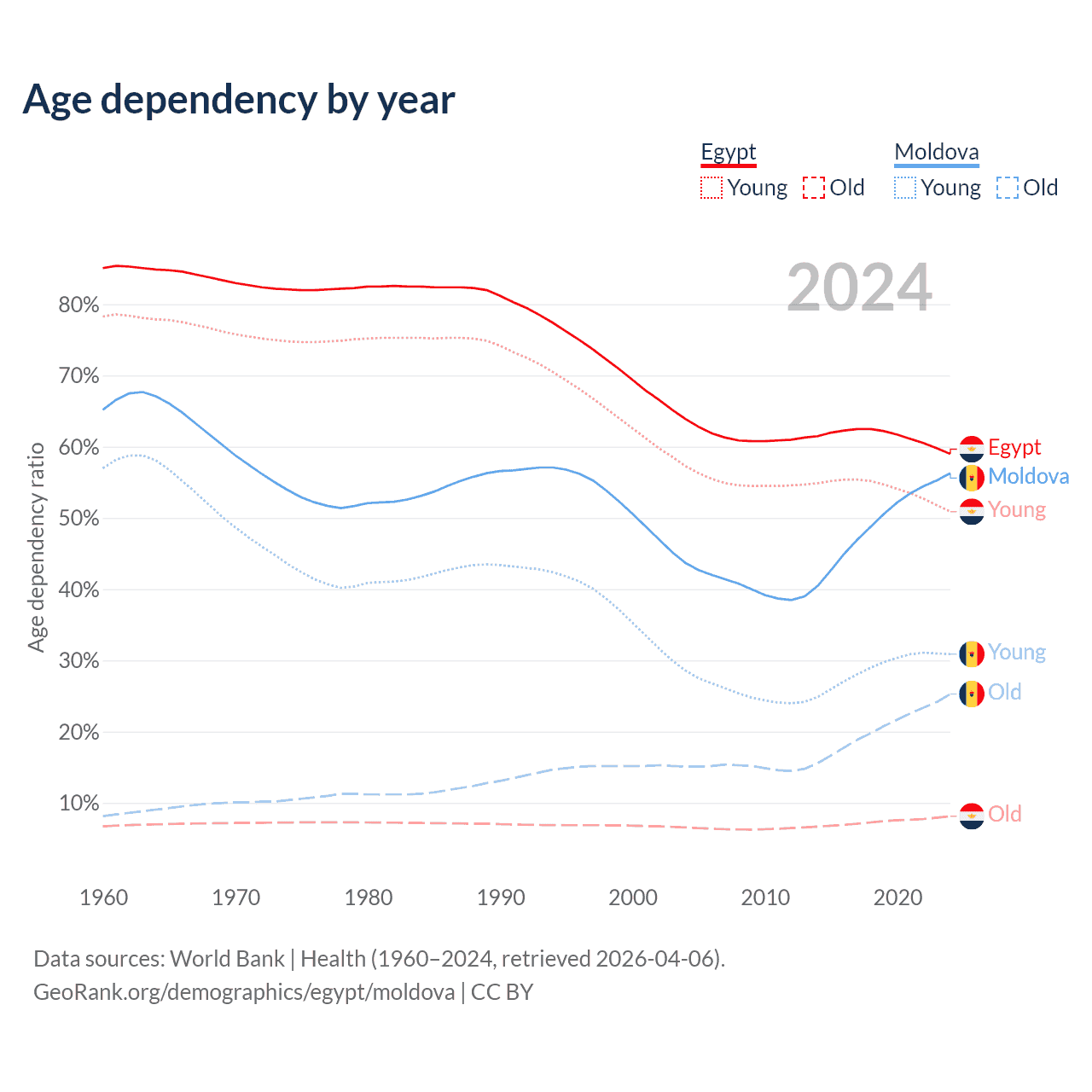 - The share of old-age demographic (65+) in Egypt is 5.12% vs 16.2% in Moldova.