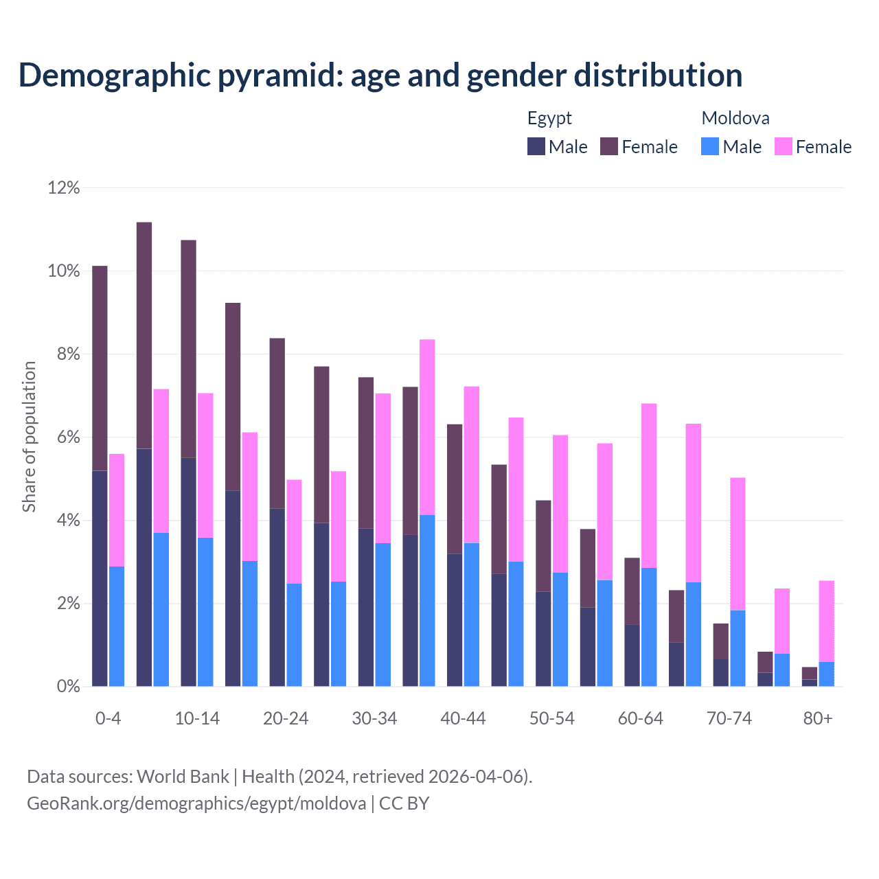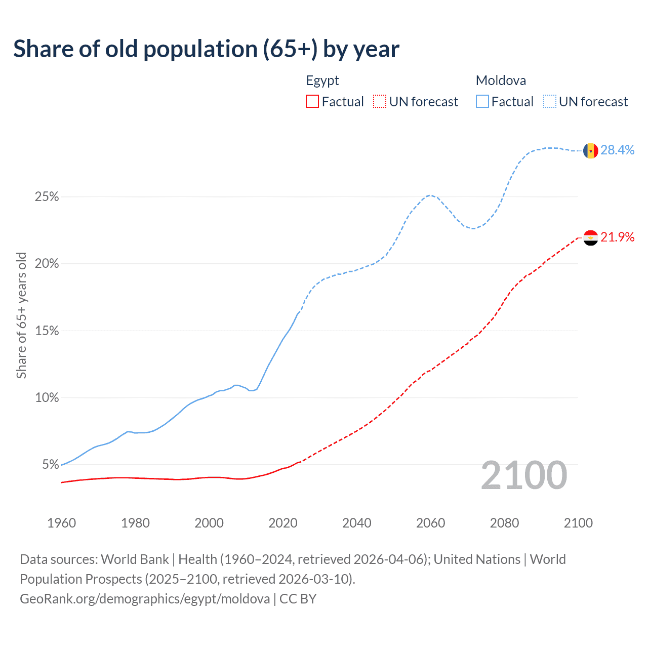The share of older people aged 65 and over is 5.12% in Egypt and 16.2% in Moldova. Life expectancy in Egypt compared to Moldova .