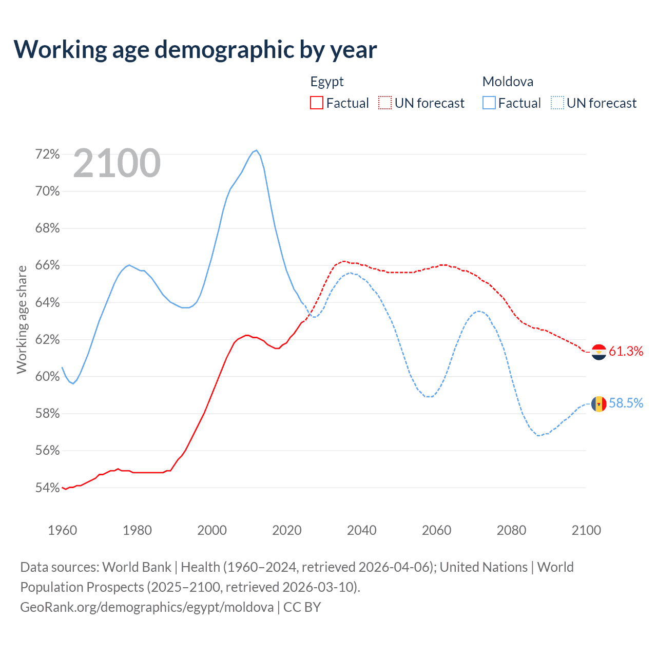 Median age Egypt vs Moldova, 1960-2100