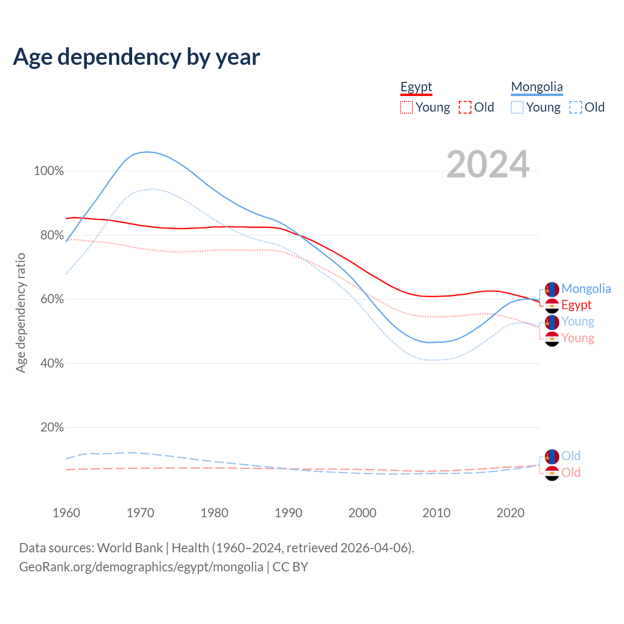 Data sources: World Bank | Health (1960–2024, retrieved 2026-04-06); U.S. Census Bureau (1960–2024, retrieved 2026-02-08).