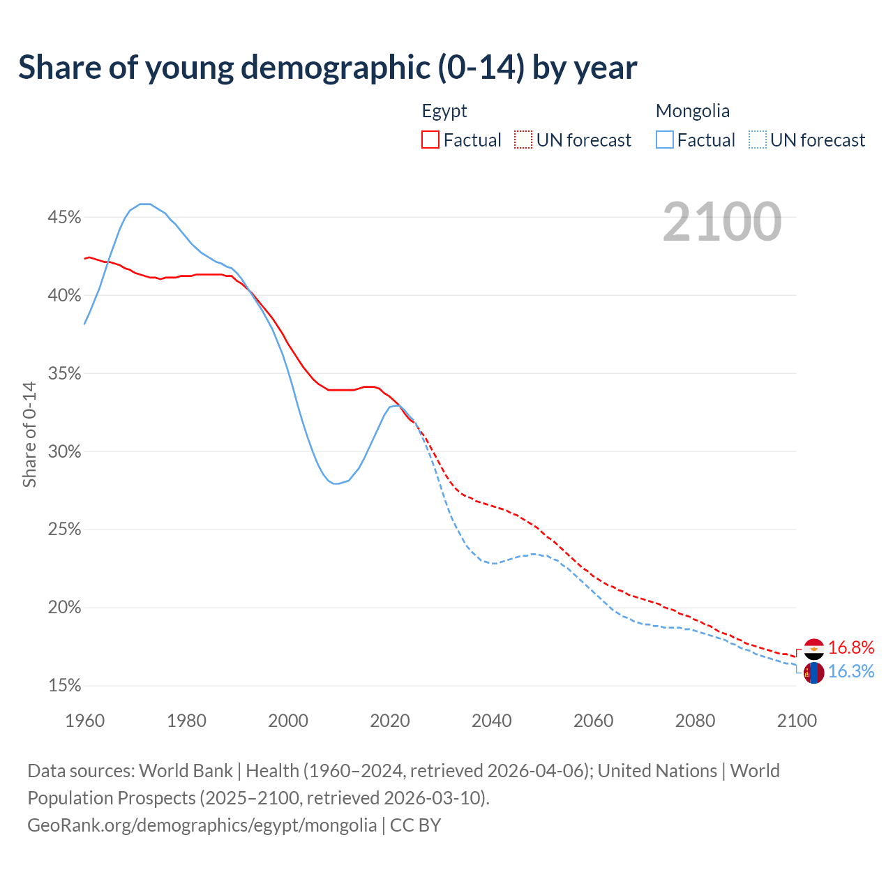 - The share of young demographic (0-15 years old) in Egypt is 32% vs 32.2% in Mongolia.