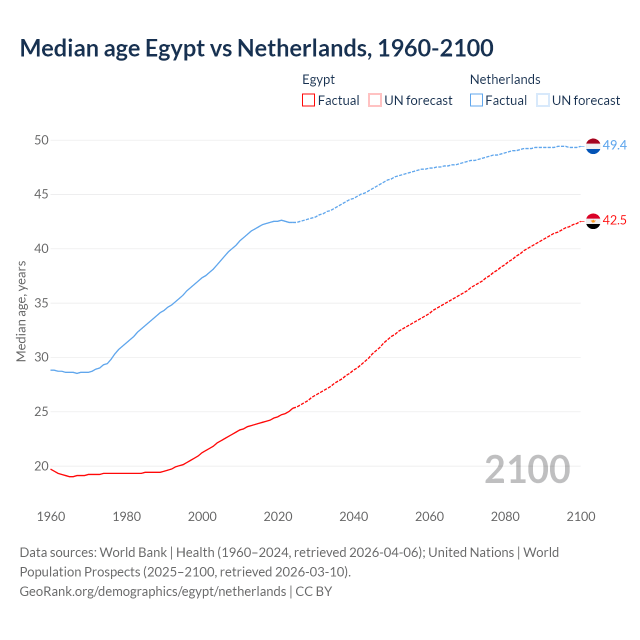 - The median age in Egypt is 25.3 years compared to 42.4 years in the Netherlands.