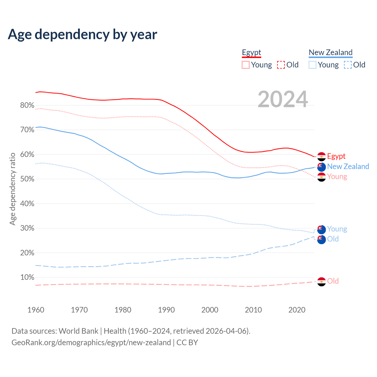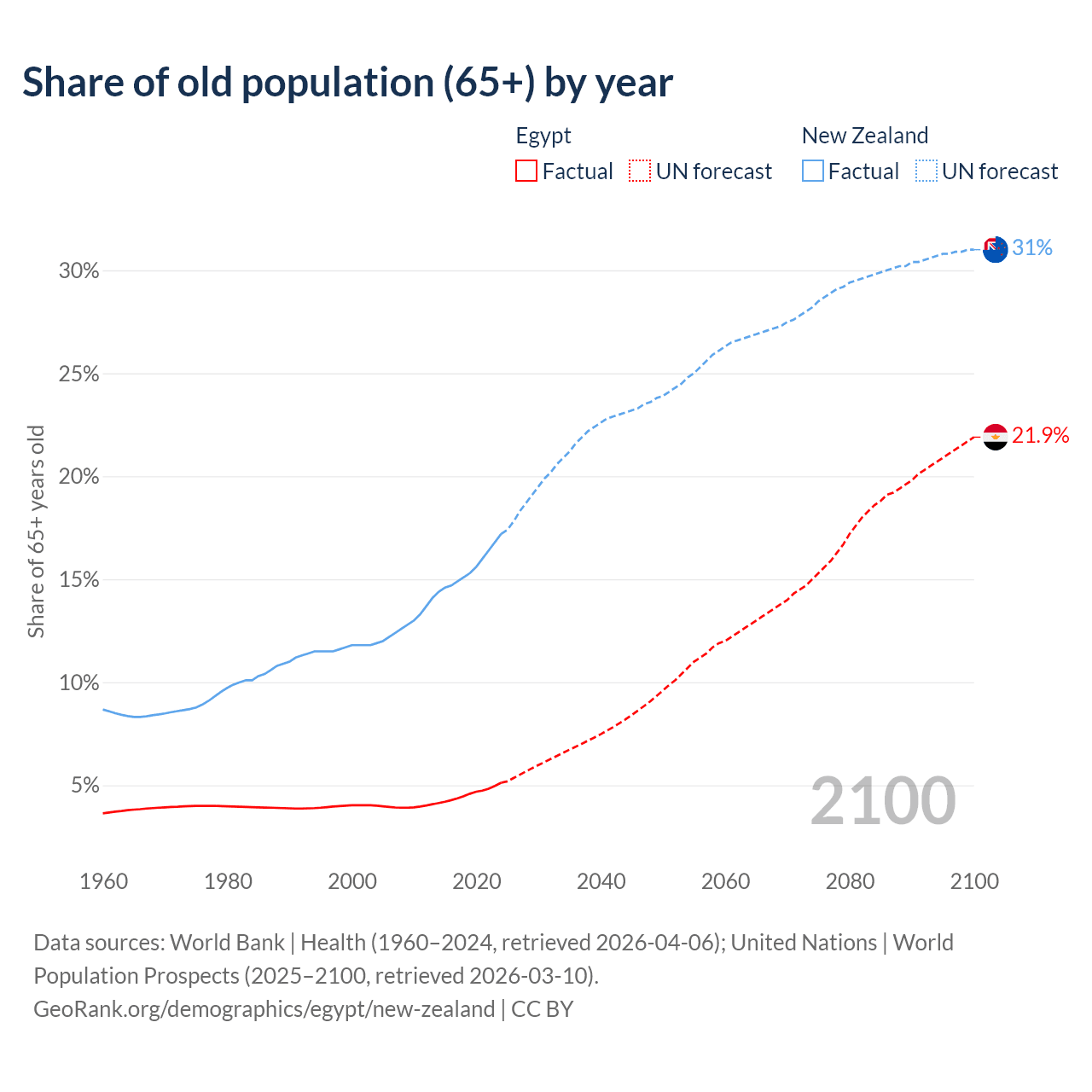 The share of older people aged 65 and over is 5.12% in Egypt and 17.2% in New Zealand. Life expectancy in Egypt compared to New Zealand .