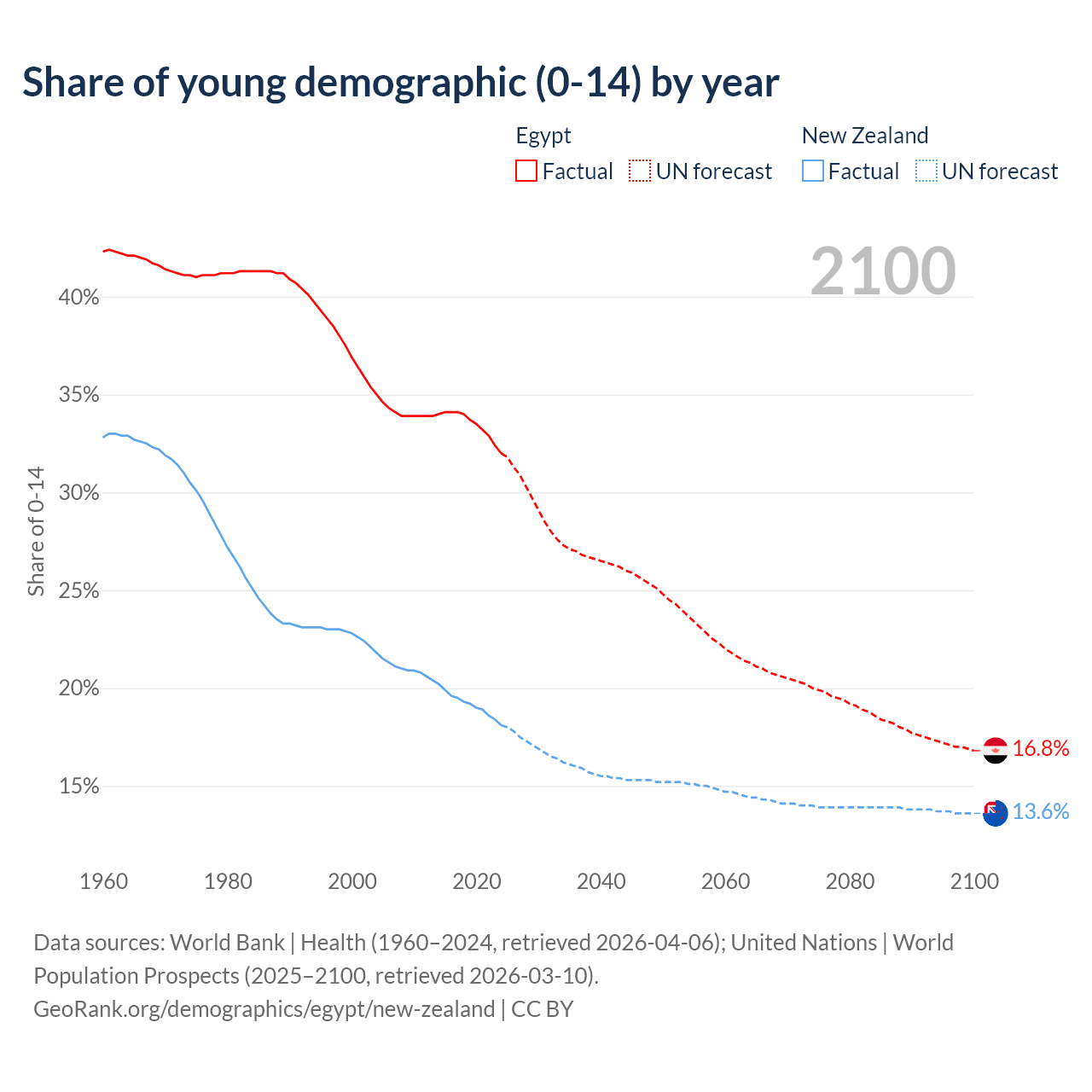 - The share of young demographic (0-15 years old) in Egypt is 32% vs 18.1% in New Zealand.