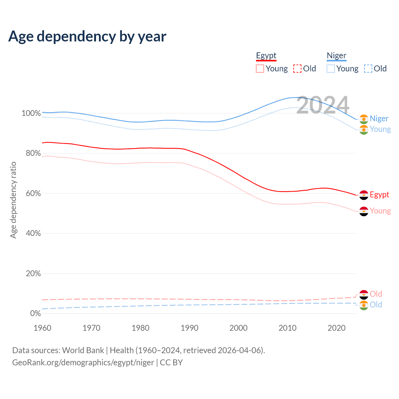 - Egypt is ranked 133/196 by median age (oldest to youngest) vs 195/196 for Niger.