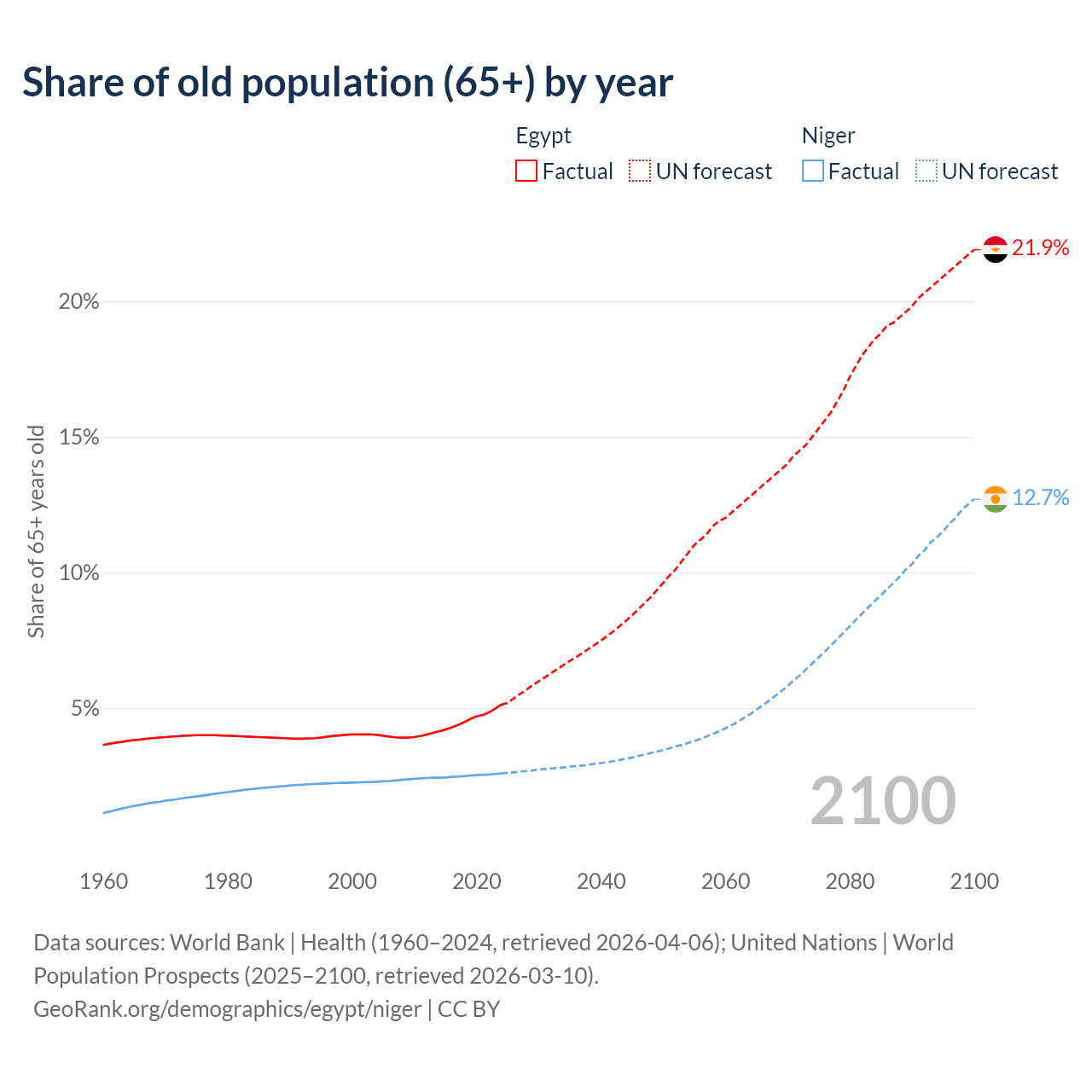The share of older people aged 65 and over is 5.12% in Egypt and 2.59% in Niger. Life expectancy in Egypt compared to Niger .