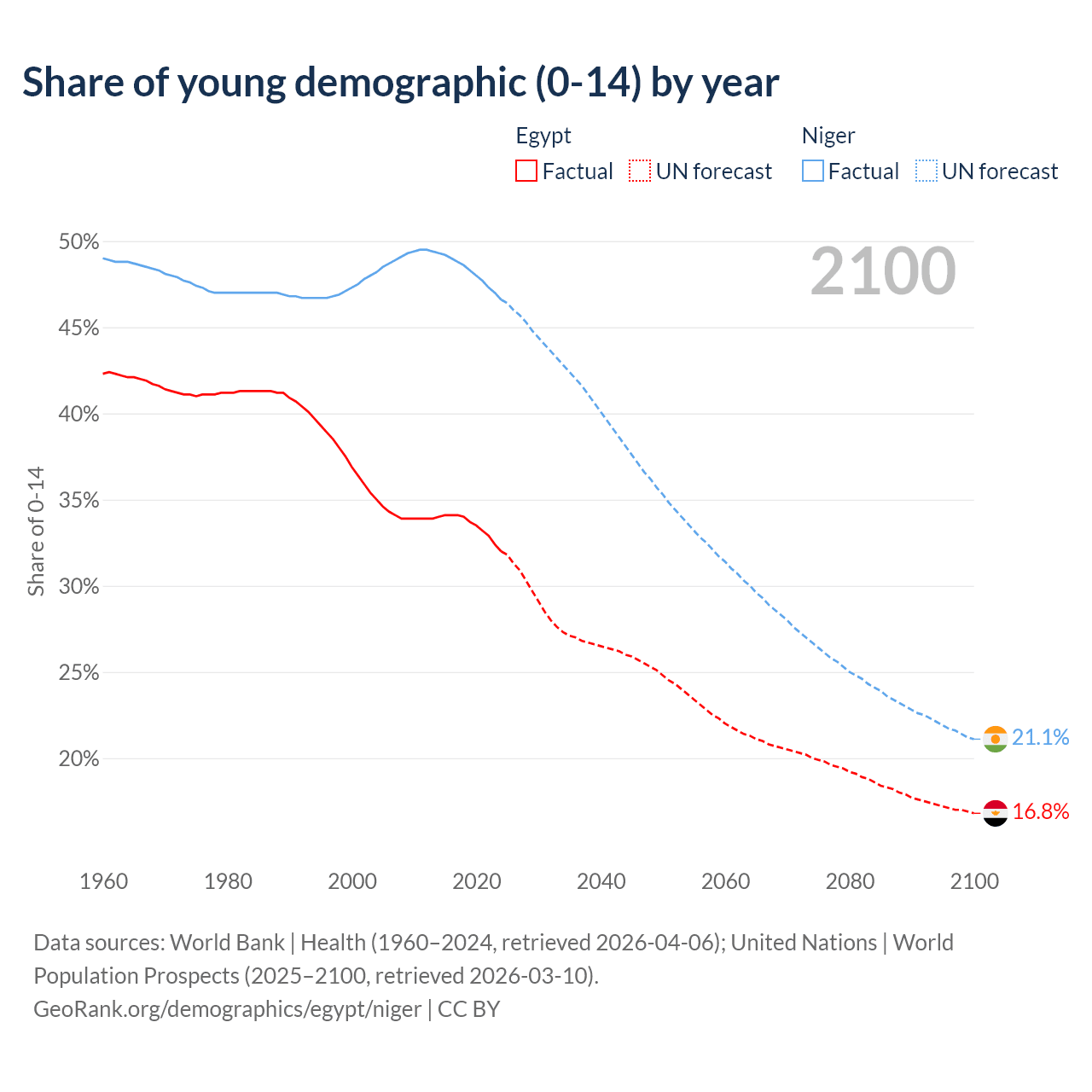 - The share of young demographic (0-15 years old) in Egypt is 32% vs 46.6% in Niger.