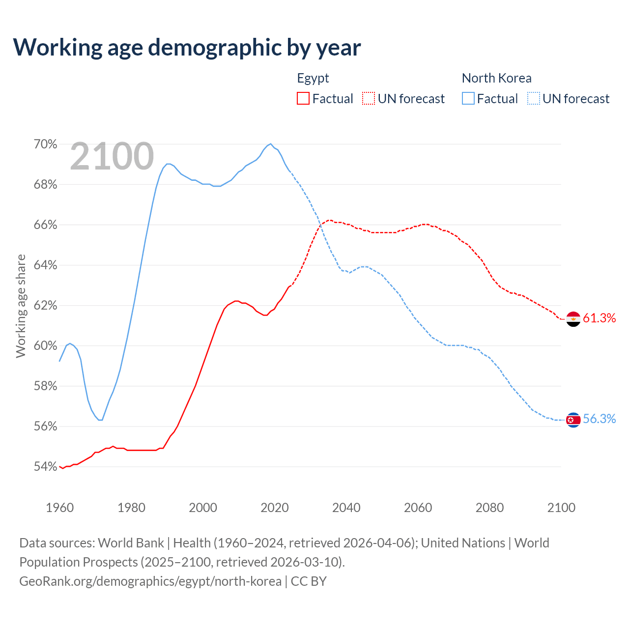 - Egypt has 75.9M working age adults (aged 15-64) vs 18.3M in North Korea.