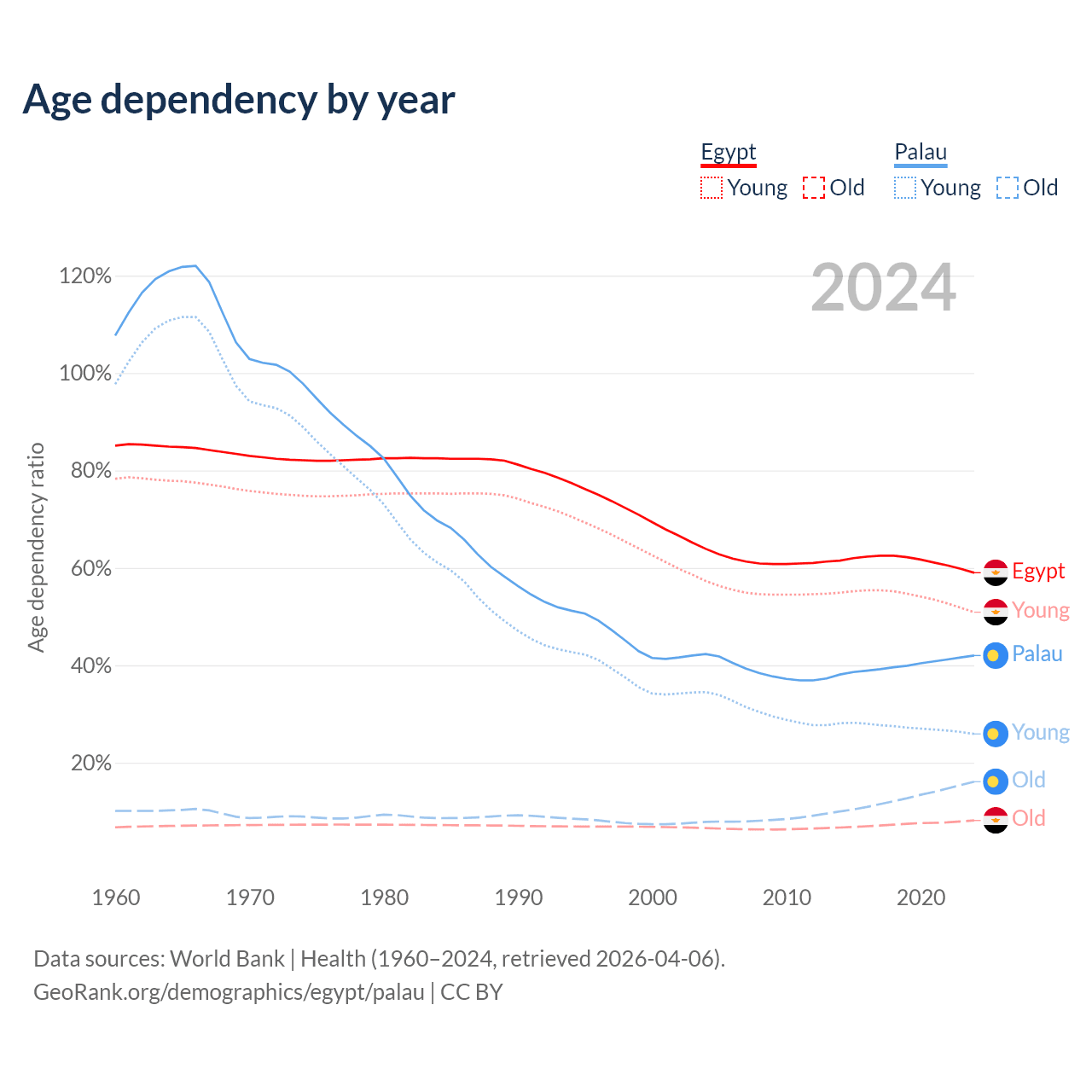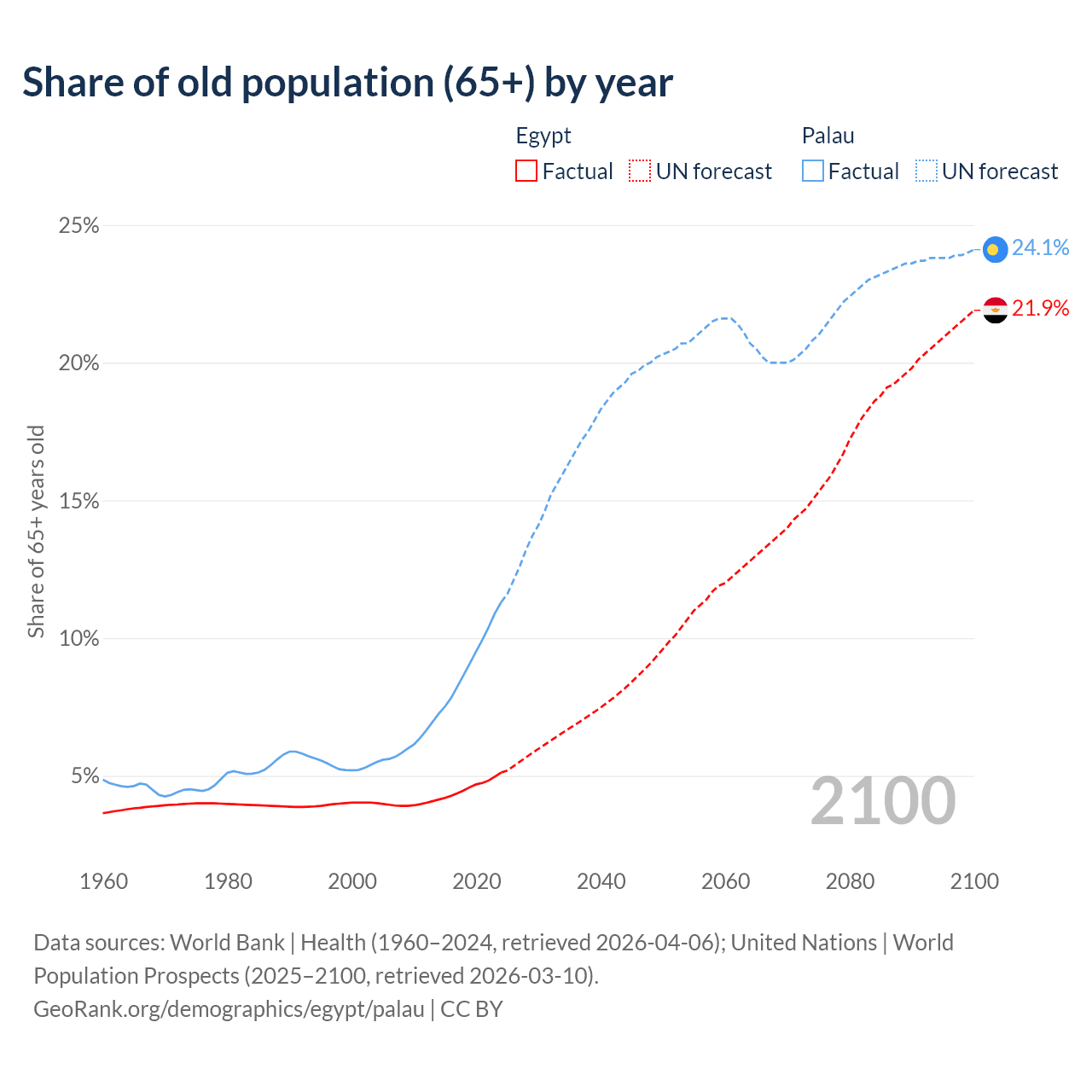 The share of older people aged 65 and over is 5.12% in Egypt and 11.3% in Palau. Life expectancy in Egypt compared to Palau .