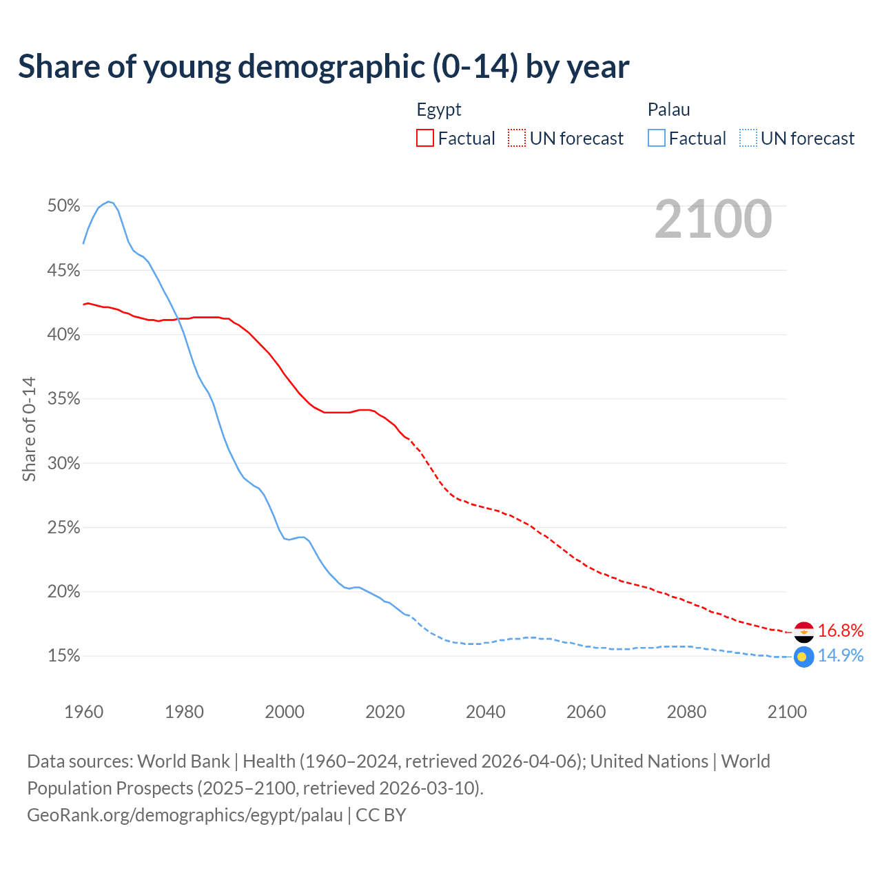 - The share of young demographic (0-15 years old) in Egypt is 32% vs 18.2% in Palau.