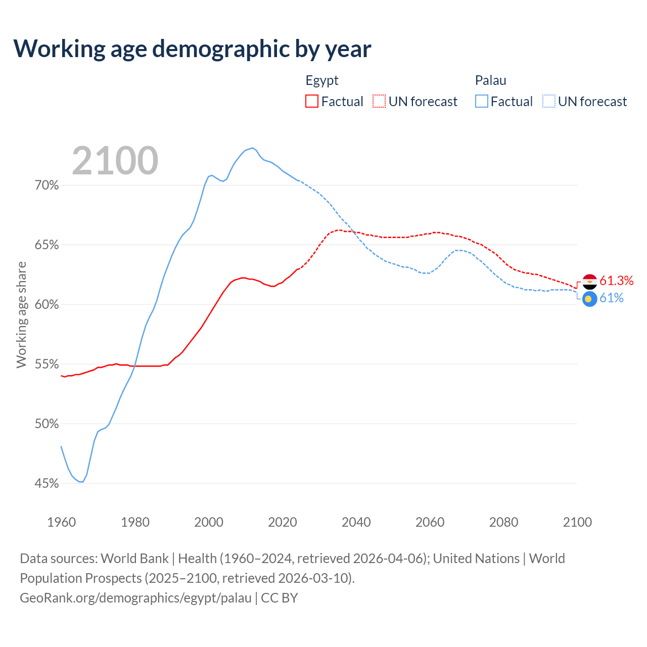 - Egypt has 75.9M working age adults (aged 15-64) vs 12.4K in Palau.