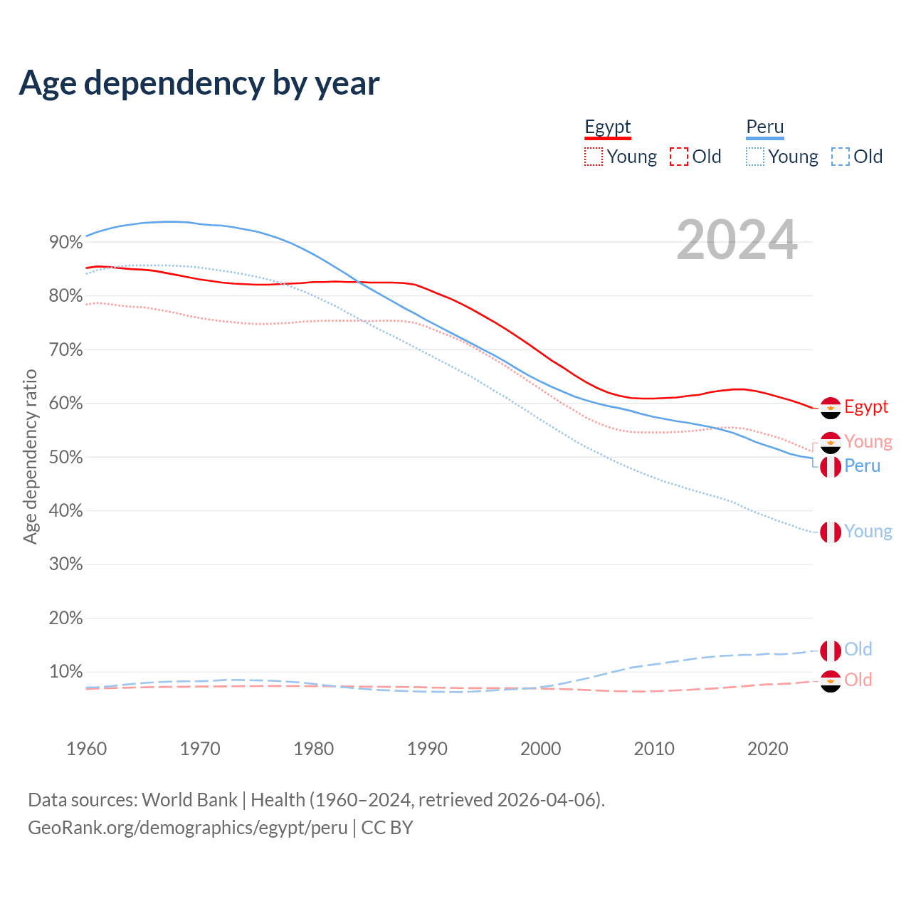 The share of older people aged 65 and over is 5.12% in Egypt and 9.23% in Peru. Life expectancy in Egypt compared to Peru .