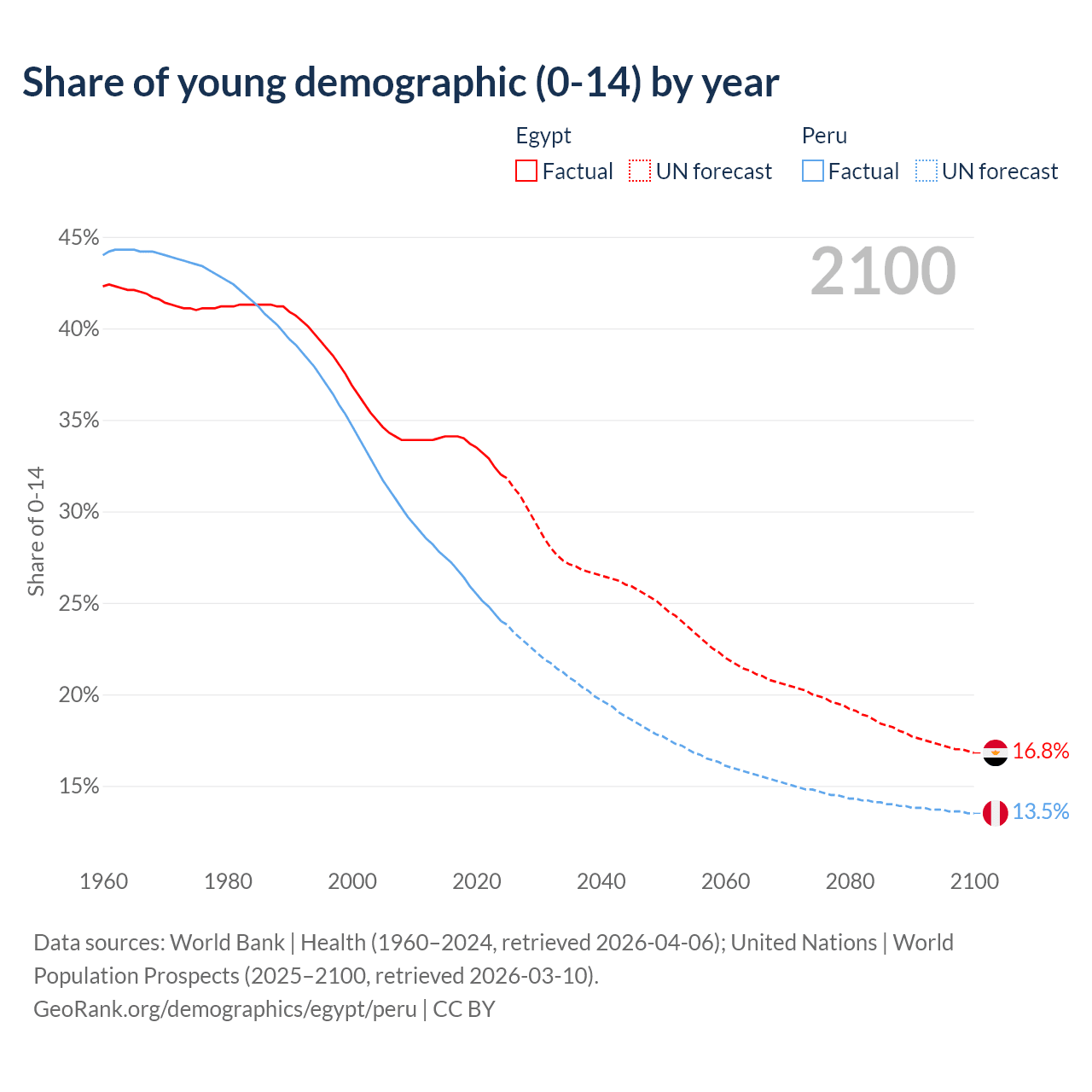 - The share of young demographic (0-15 years old) in Egypt is 32% vs 24% in Peru.
