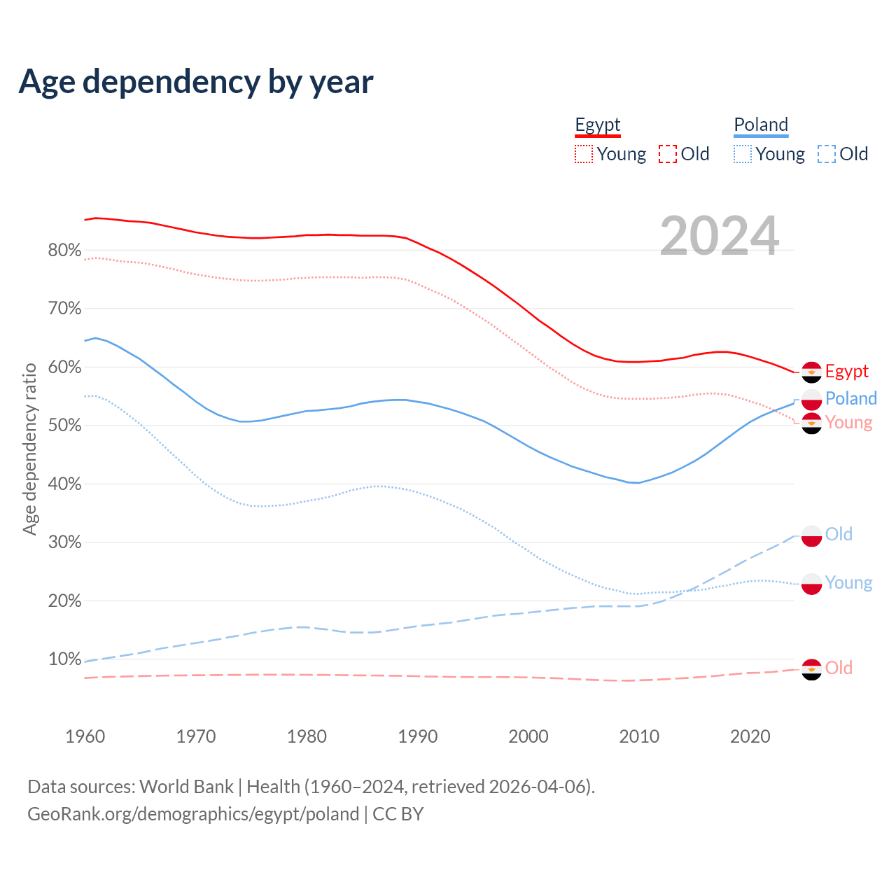 The share of older people aged 65 and over is 5.12% in Egypt and 20.1% in Poland. Life expectancy in Egypt compared to Poland .