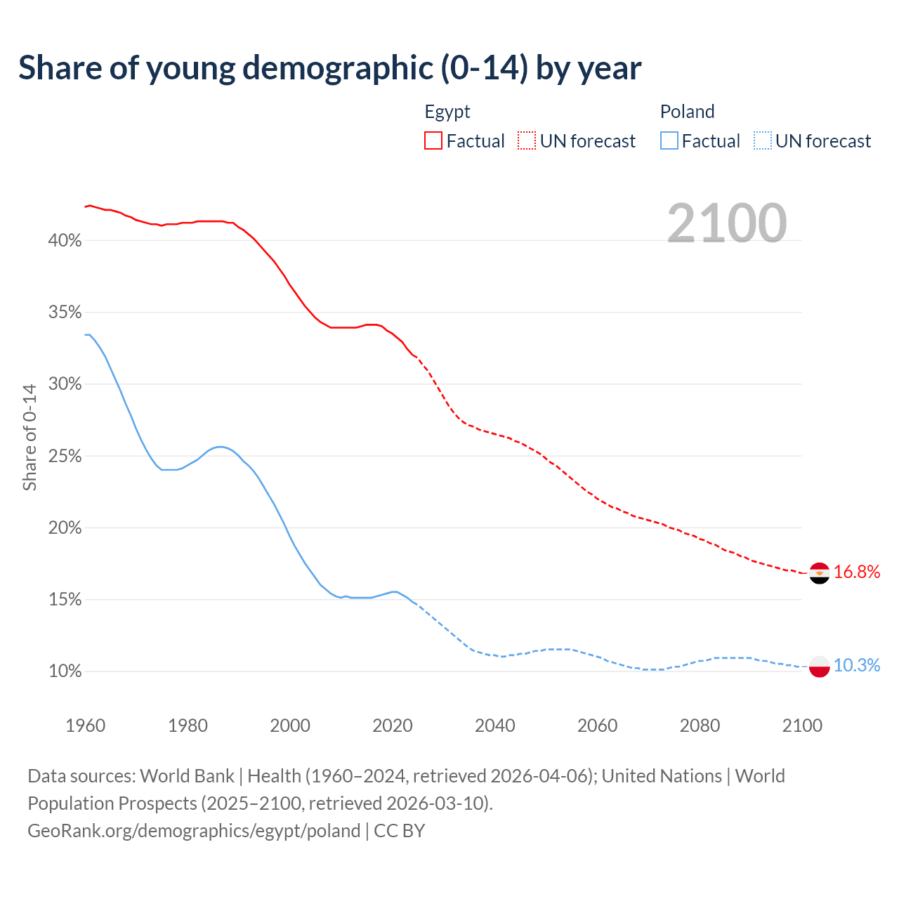 - The share of young demographic (0-15 years old) in Egypt is 32% vs 14.8% in Poland.