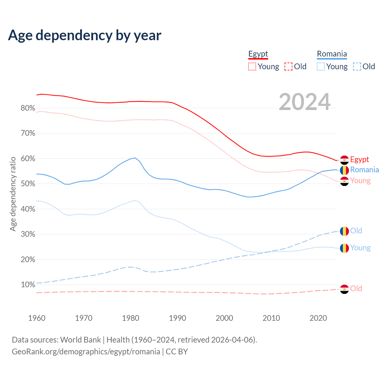 - Egypt is ranked 133/196 by median age (oldest to youngest) vs 23/196 for Romania.