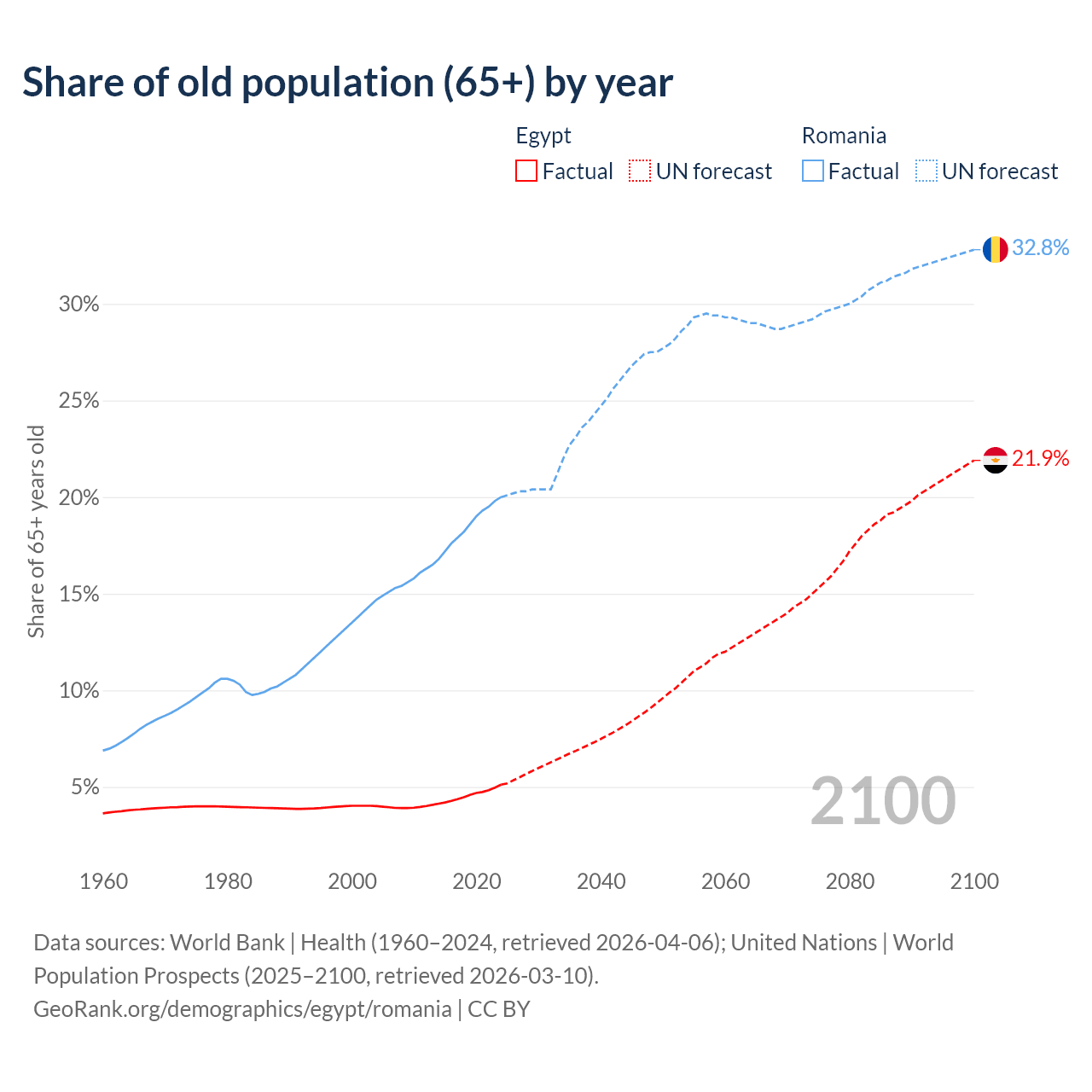 The share of older people aged 65 and over is 5.12% in Egypt and 20% in Romania. Life expectancy in Egypt compared to Romania .