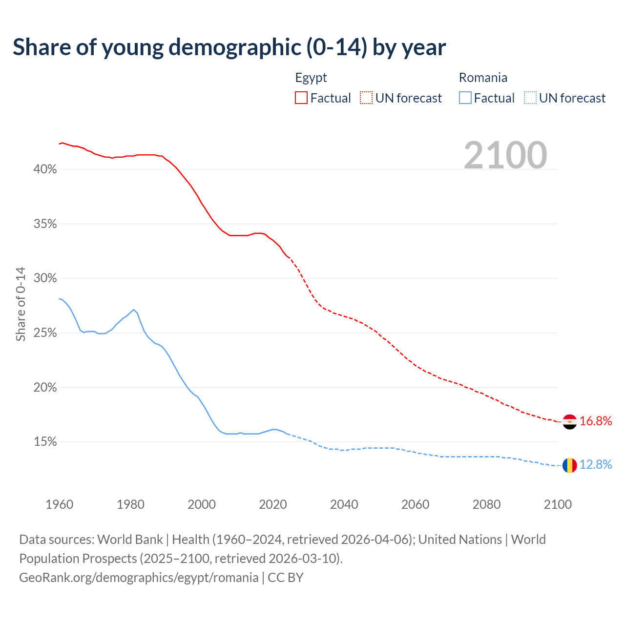 - The share of young demographic (0-15 years old) in Egypt is 32% vs 15.7% in Romania.
