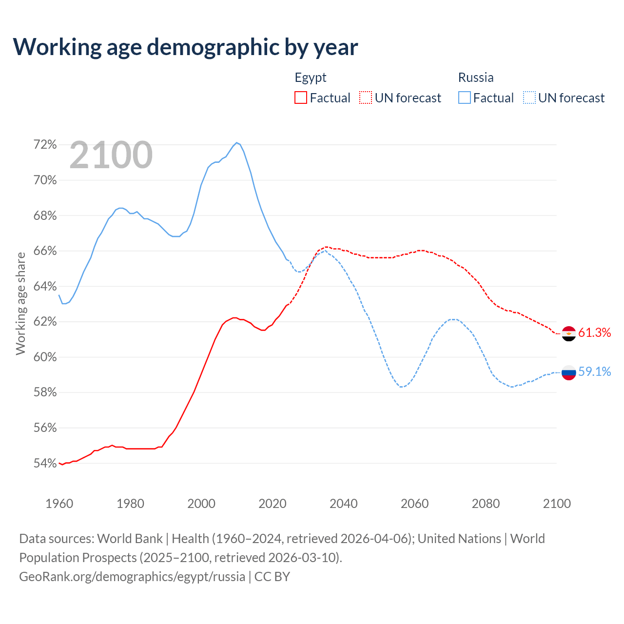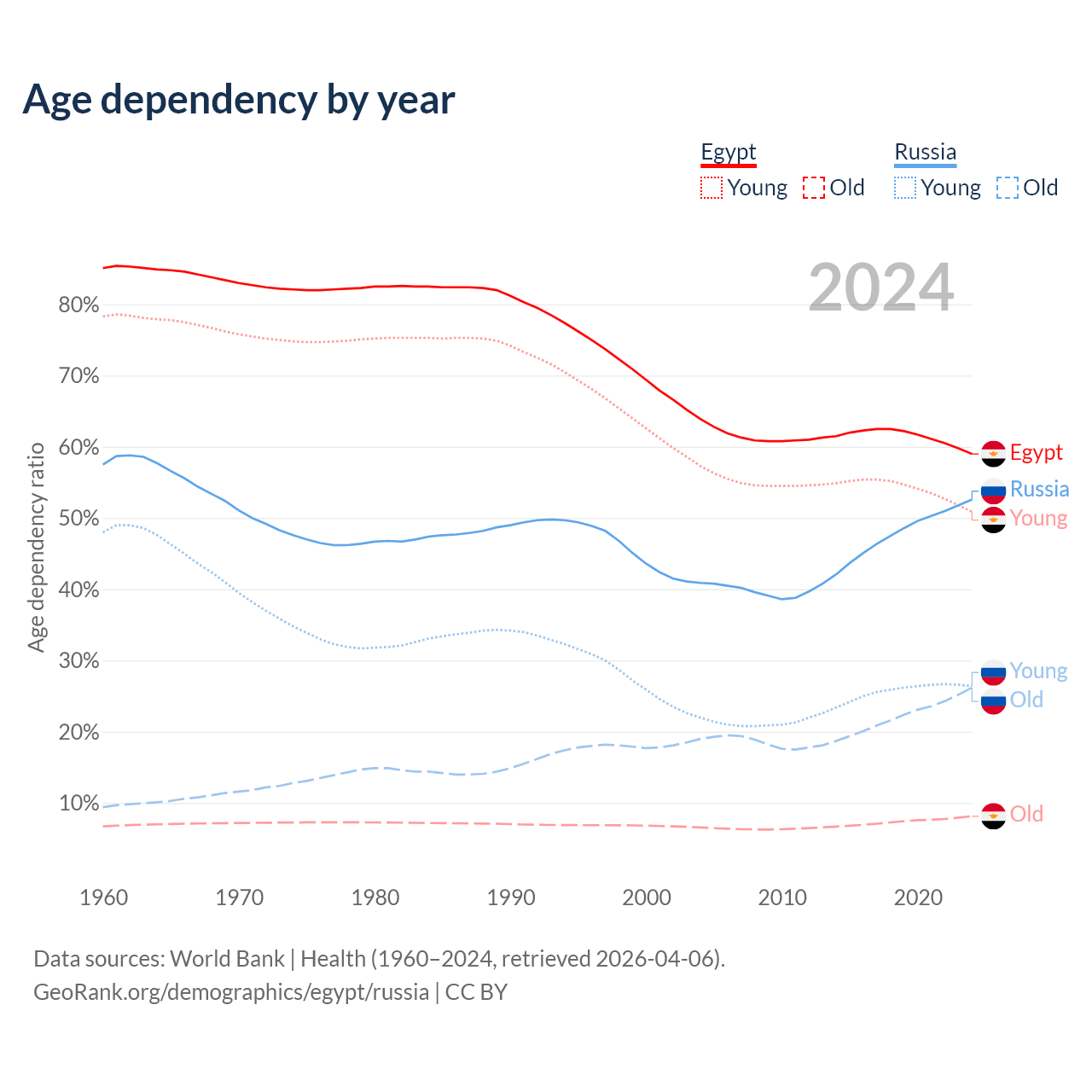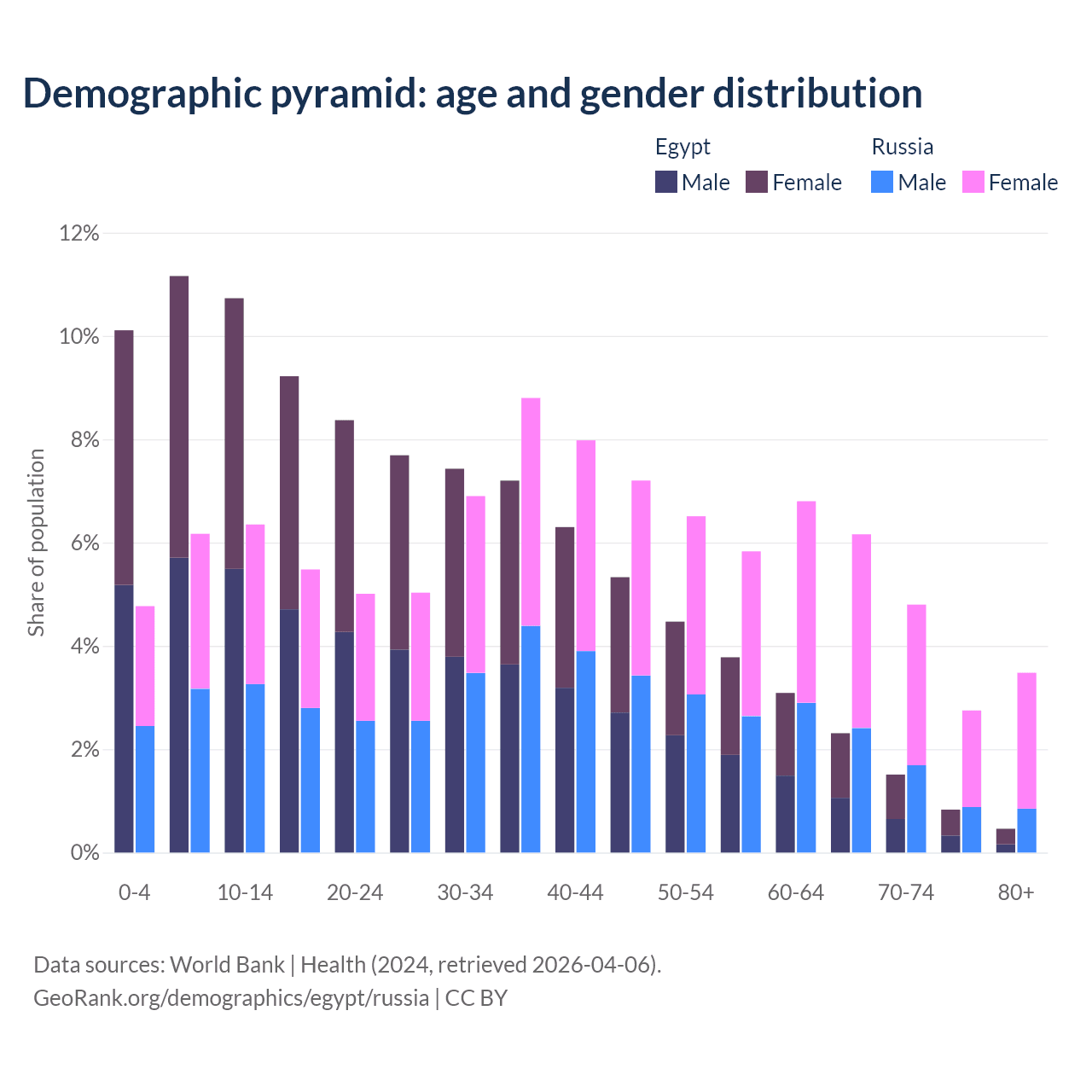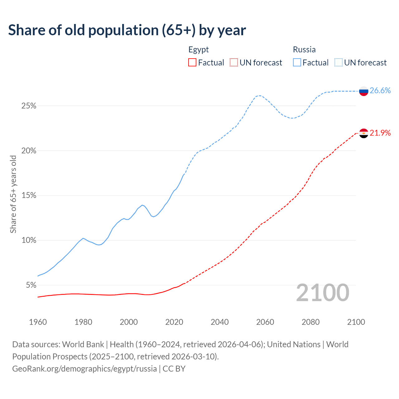 The share of older people aged 65 and over is 5.12% in Egypt and 17.2% in Russia. Life expectancy in Egypt compared to Russia .