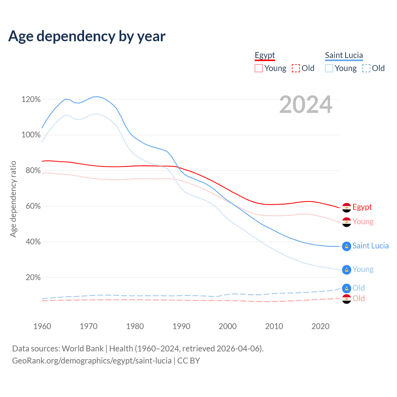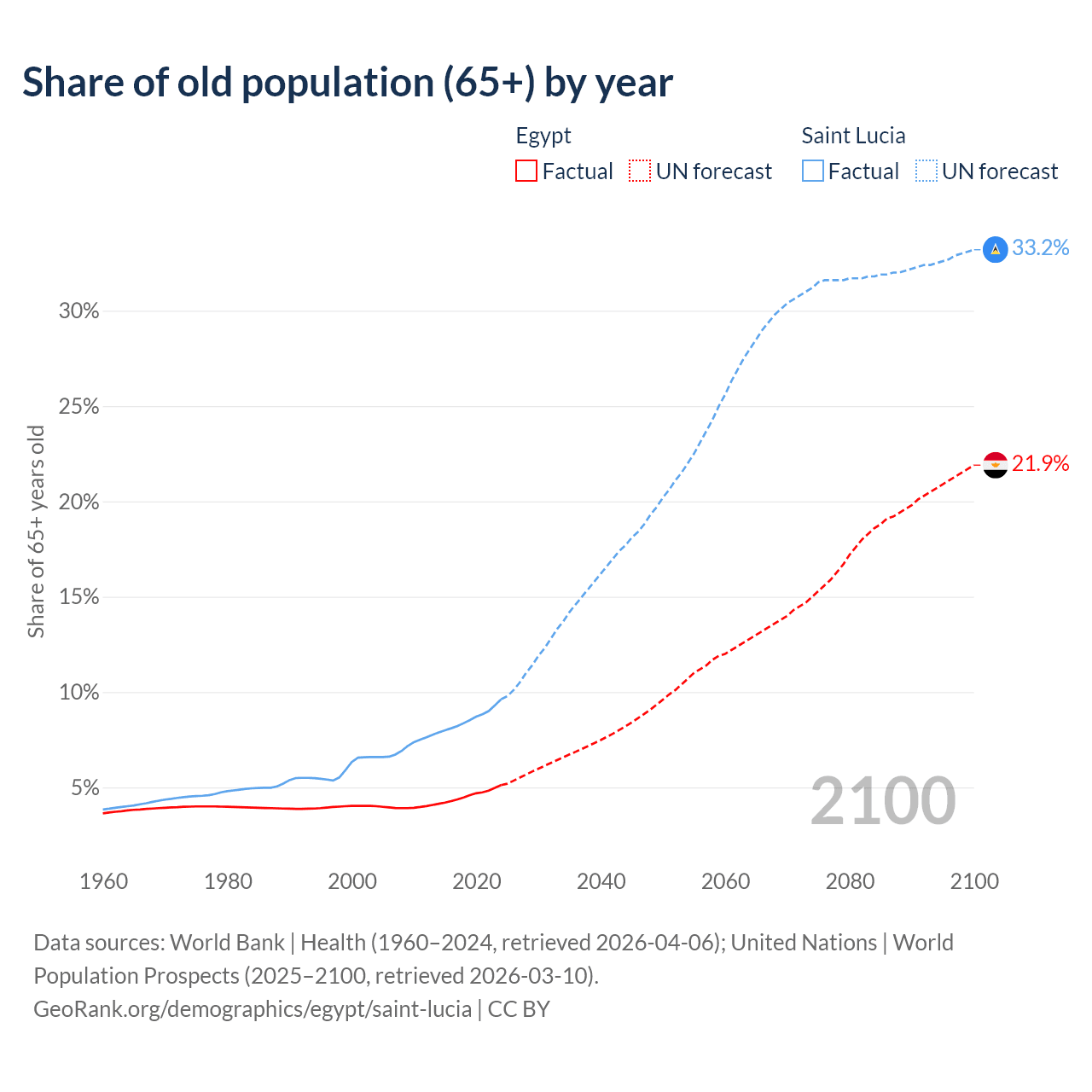 The share of older people aged 65 and over is 5.12% in Egypt and 9.62% in Saint Lucia. Life expectancy in Egypt compared to Saint Lucia .
