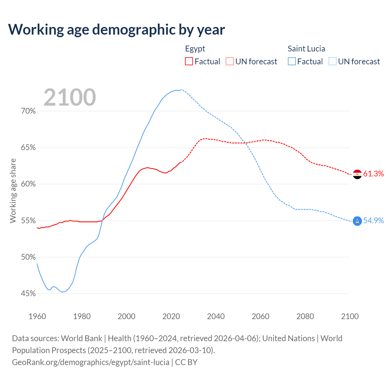 - The share of young demographic (0-15 years old) in Egypt is 32% vs 17.5% in Saint Lucia.