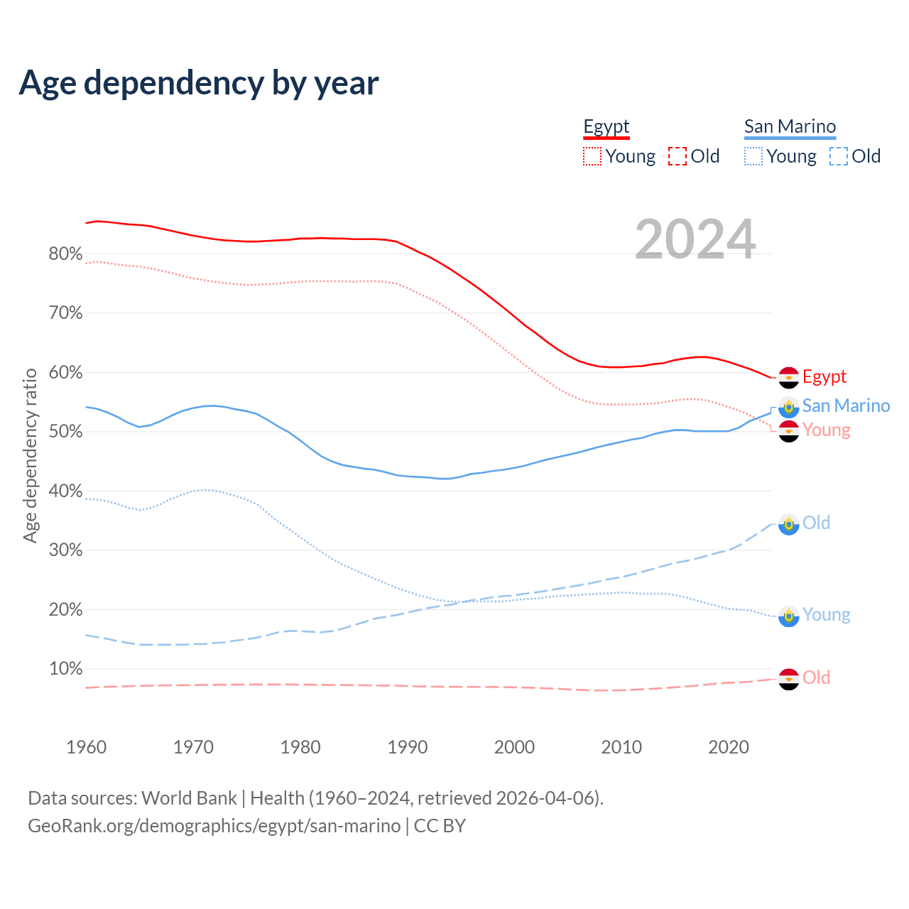The share of older people aged 65 and over is 5.12% in Egypt and 22.4% in San Marino. Life expectancy in Egypt compared to San Marino .