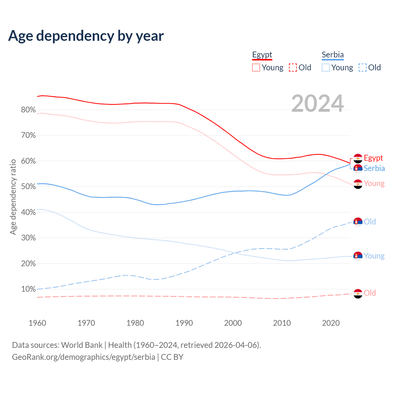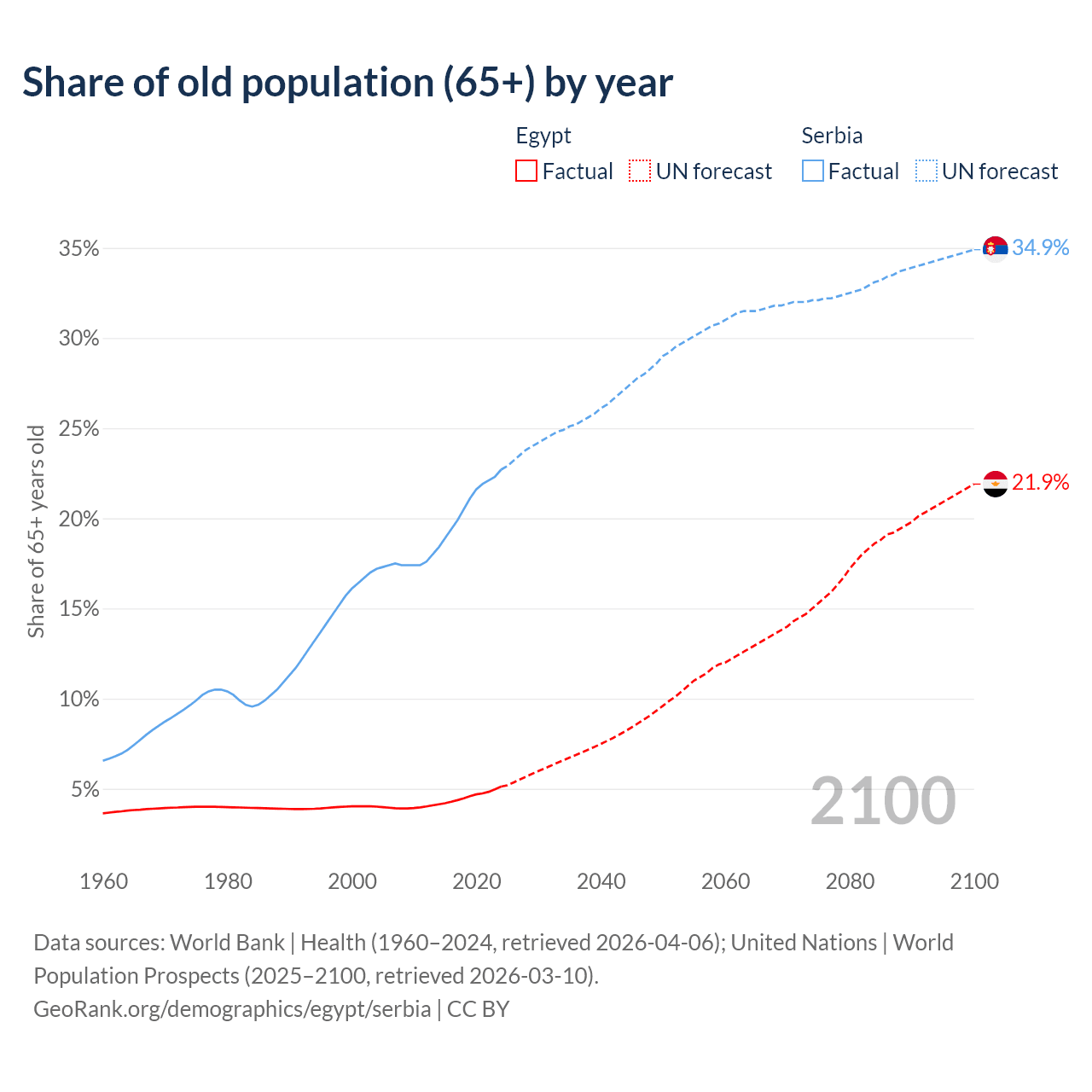 The share of older people aged 65 and over is 5.12% in Egypt and 22.7% in Serbia. Life expectancy in Egypt compared to Serbia .