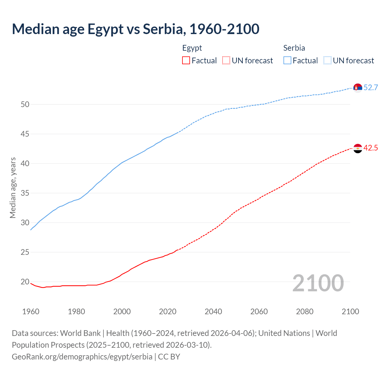 - The median age in Egypt is 25.3 years compared to 45.1 years in Serbia.