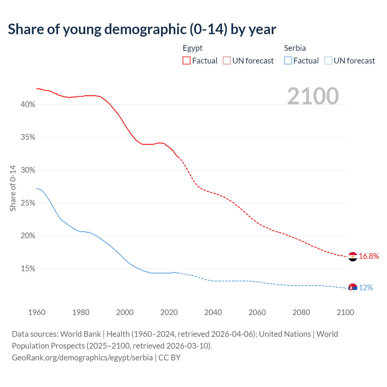 - The share of young demographic (0-15 years old) in Egypt is 32% vs 14.3% in Serbia.