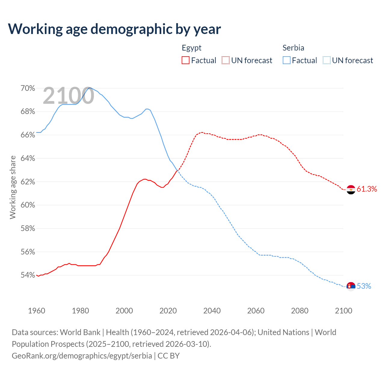 - Egypt has 75.9M working age adults (aged 15-64) vs 4.09M in Serbia.