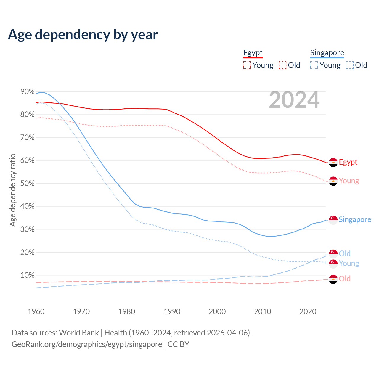 The share of older people aged 65 and over is 5.12% in Egypt and 13.7% in Singapore. Life expectancy in Egypt compared to Singapore .