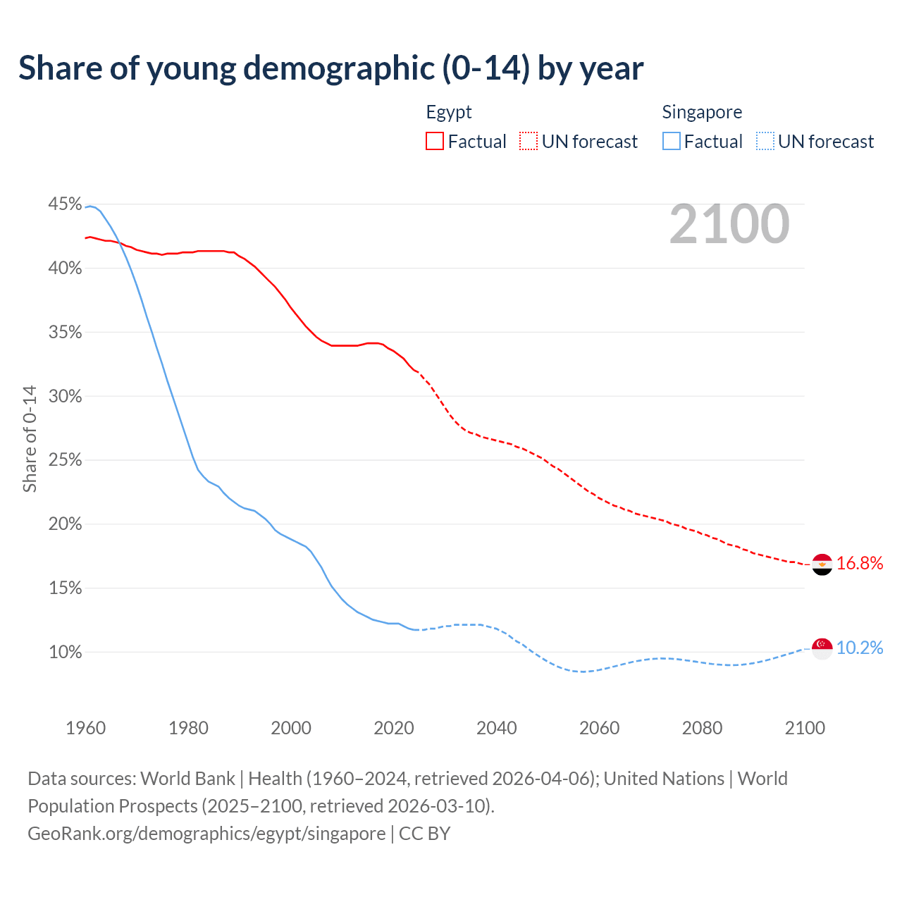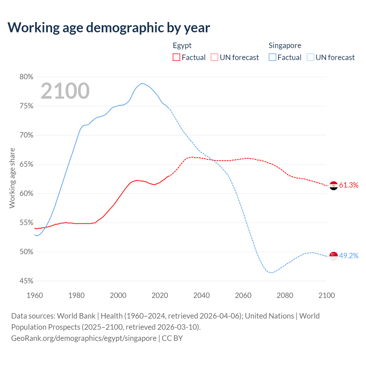 Median age Egypt vs Singapore, 1960-2100