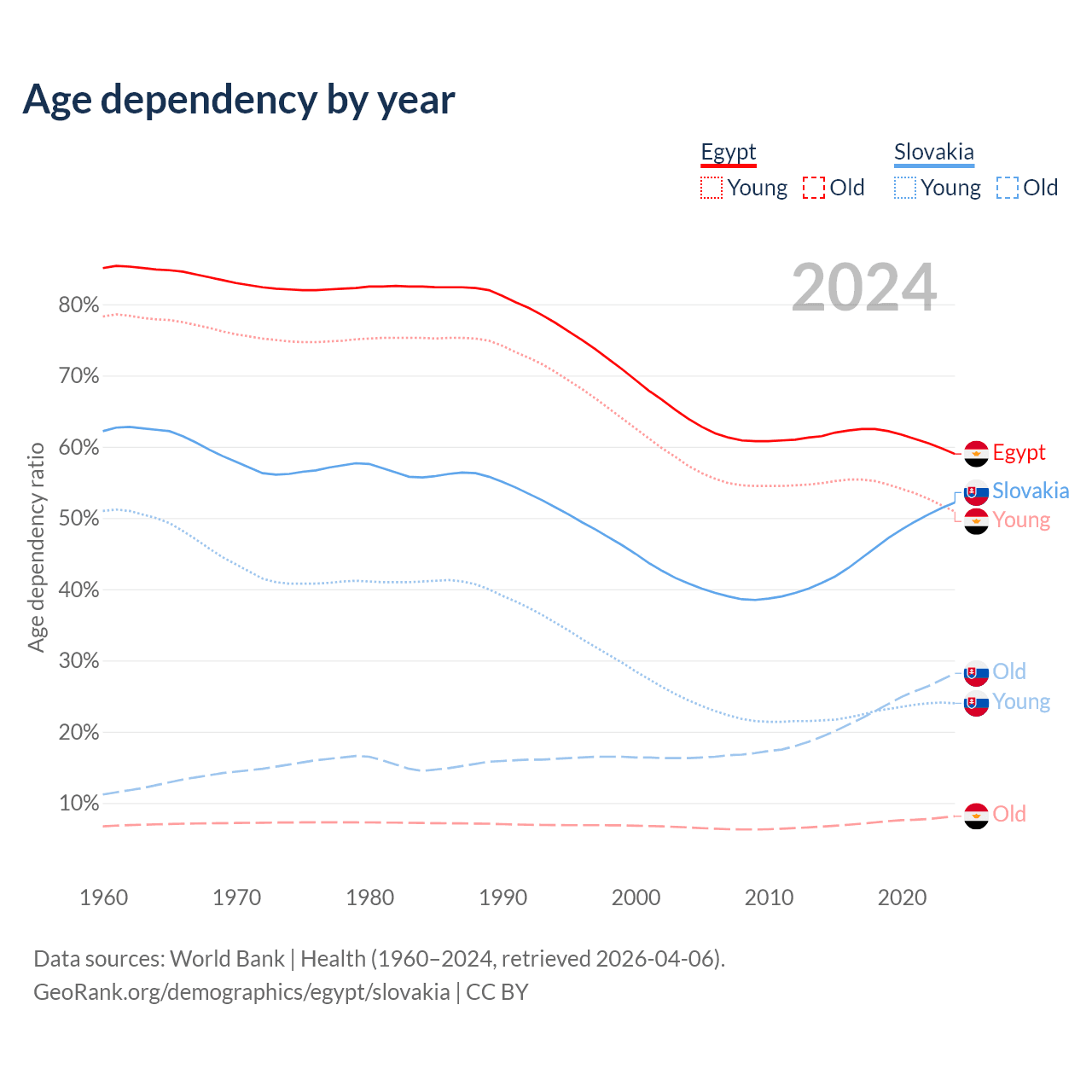 - Egypt is ranked 133/196 by median age (oldest to youngest) vs 31/196 for Slovakia.