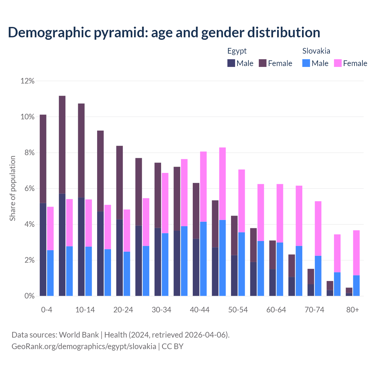 - As of 2026, the population of Egypt is 121M vs 5.36M in Slovakia - 22.5 times difference.