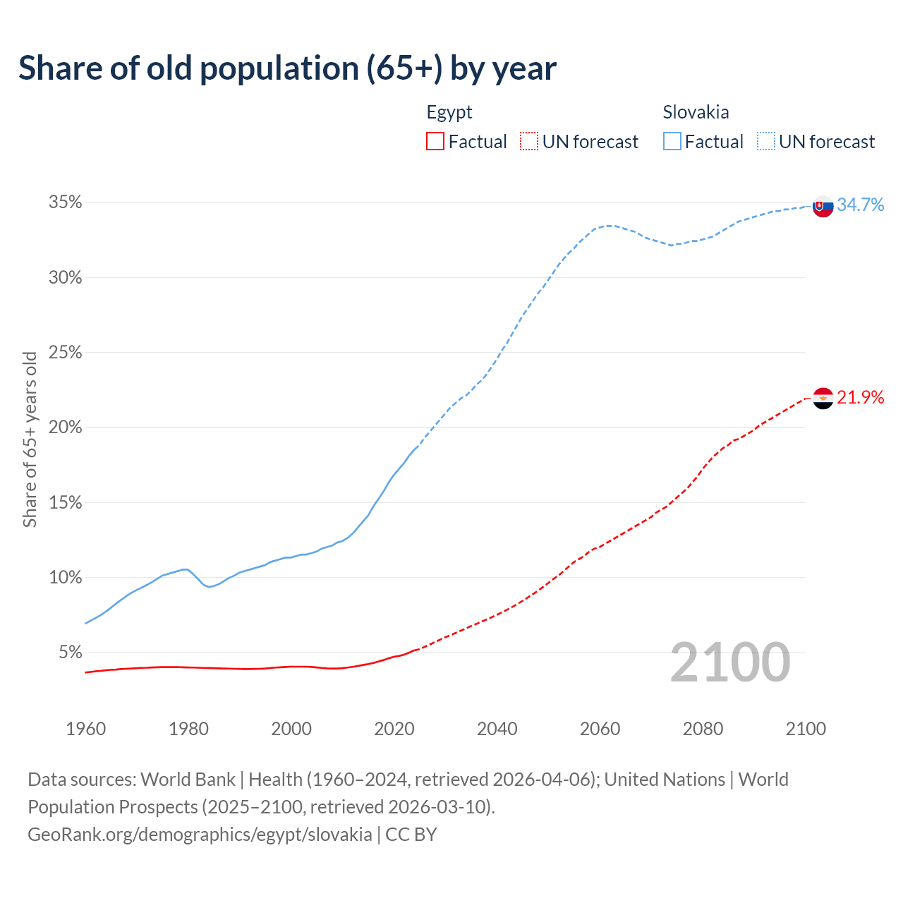 The share of older people aged 65 and over is 5.12% in Egypt and 18.5% in Slovakia. Life expectancy in Egypt compared to Slovakia .