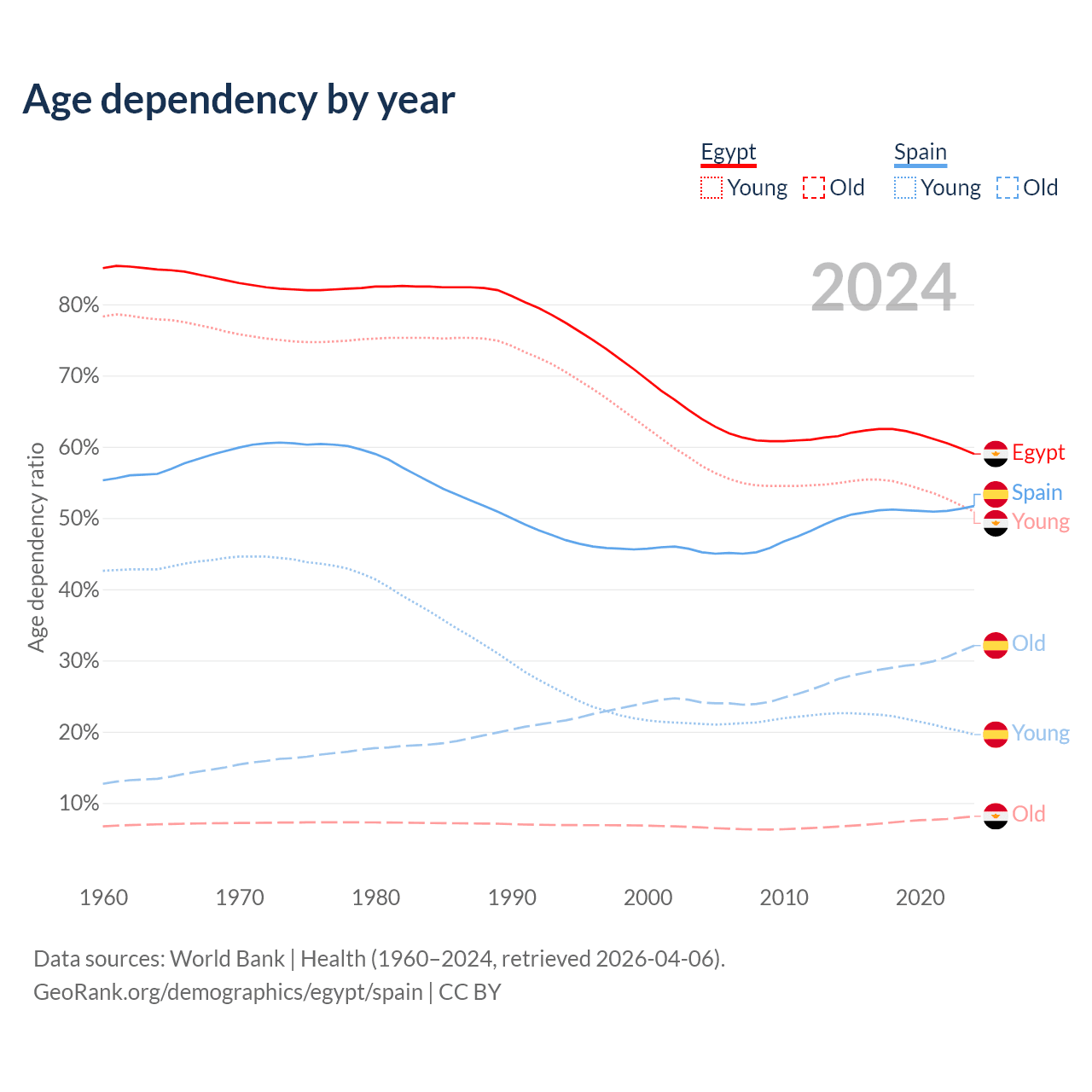 - Egypt is ranked 133/196 by median age (oldest to youngest) vs 7/196 for Spain.