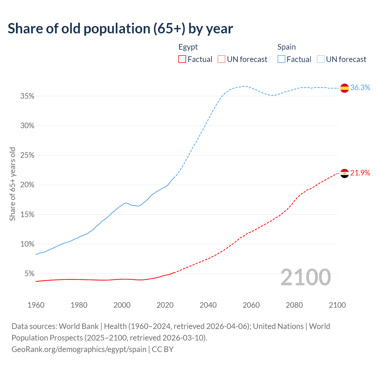 The share of older people aged 65 and over is 5.12% in Egypt and 21.1% in Spain. Life expectancy in Egypt compared to Spain .
