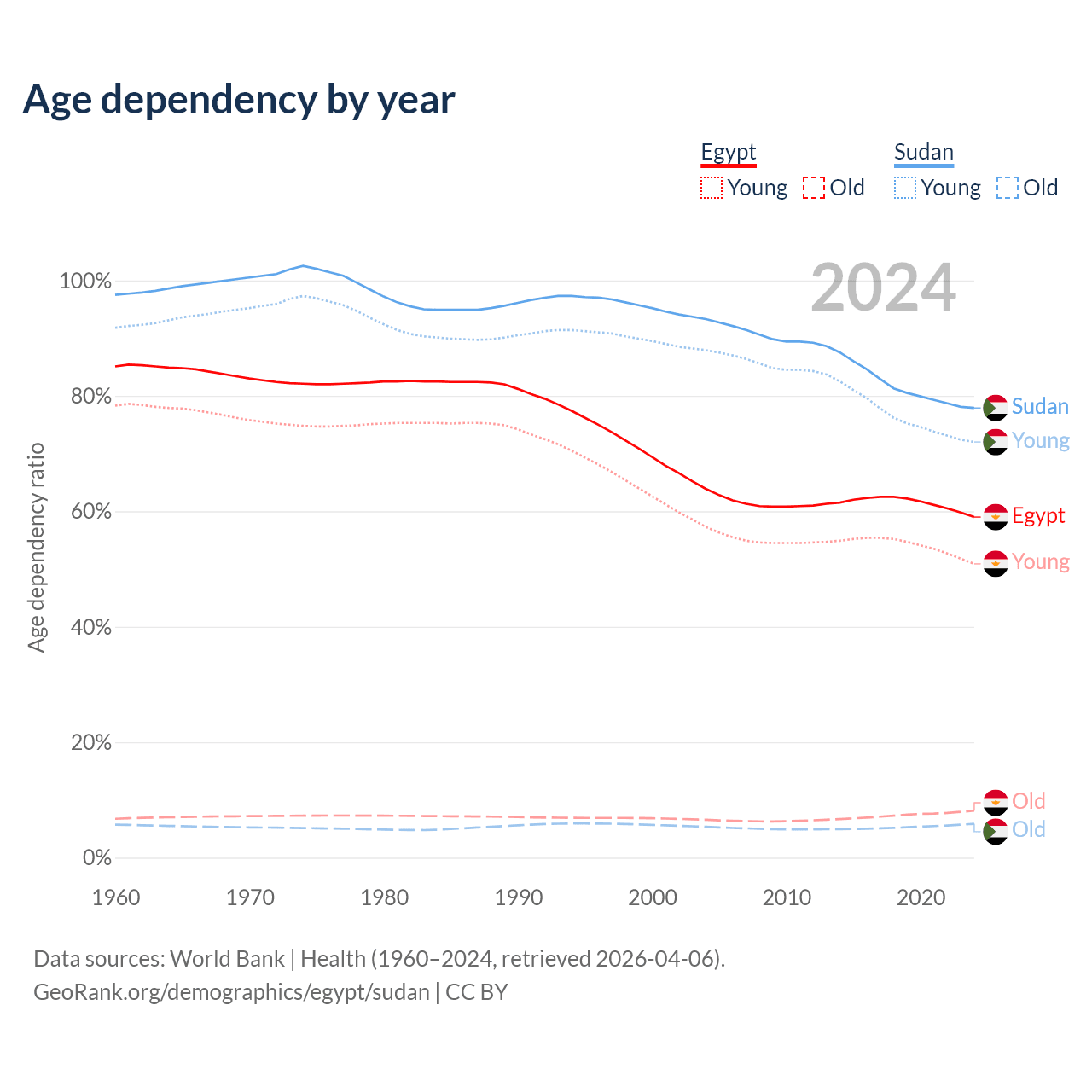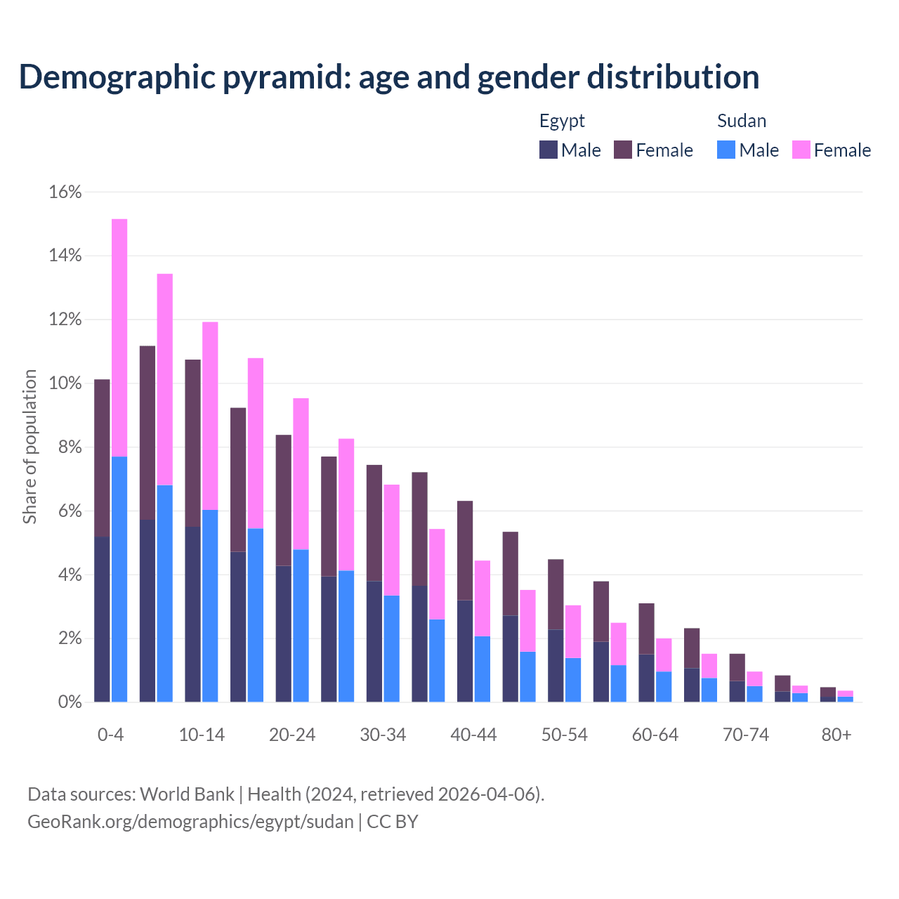 - Egypt is ranked 133/196 by median age (oldest to youngest) vs 172/196 for Sudan.