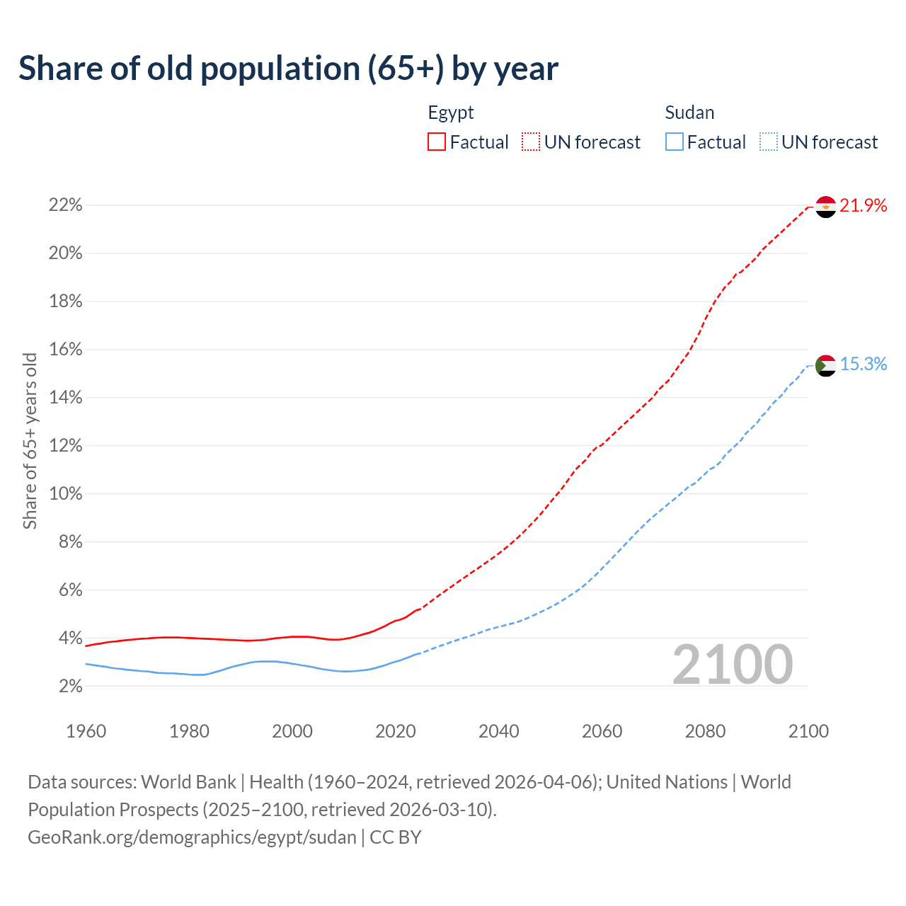 The share of older people aged 65 and over is 5.12% in Egypt and 3.3% in Sudan. Life expectancy in Egypt compared to Sudan .