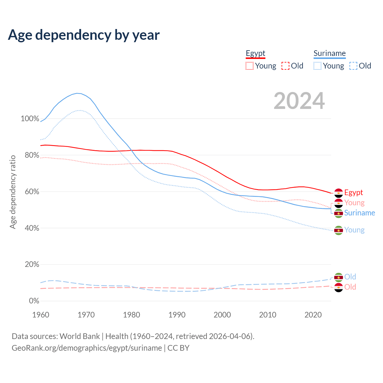 - Egypt is ranked 133/196 by median age (oldest to youngest) vs 109/196 for Suriname.