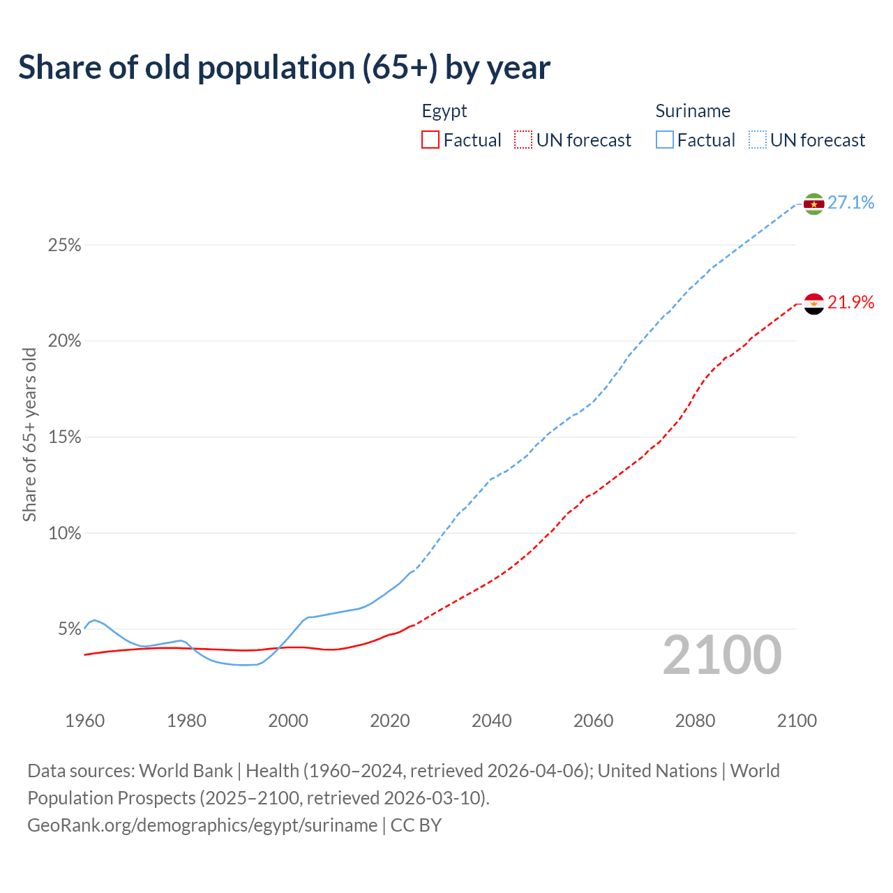 The share of older people aged 65 and over is 5.12% in Egypt and 7.9% in Suriname. Life expectancy in Egypt compared to Suriname .