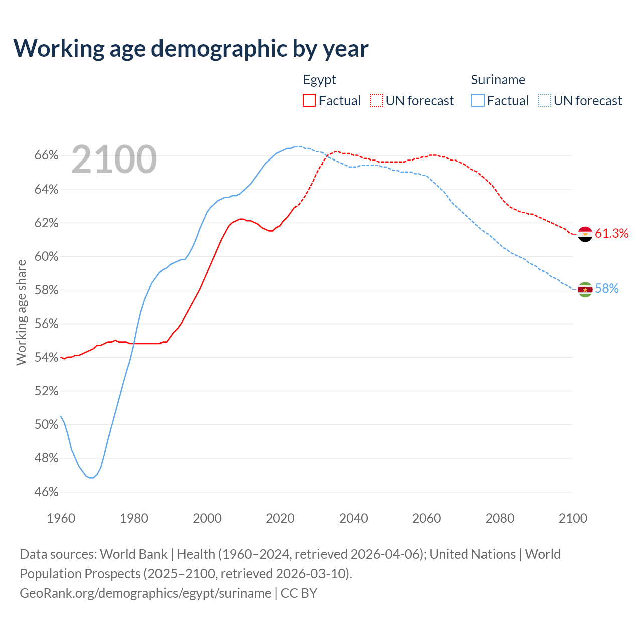Median age Egypt vs Suriname, 1960-2100