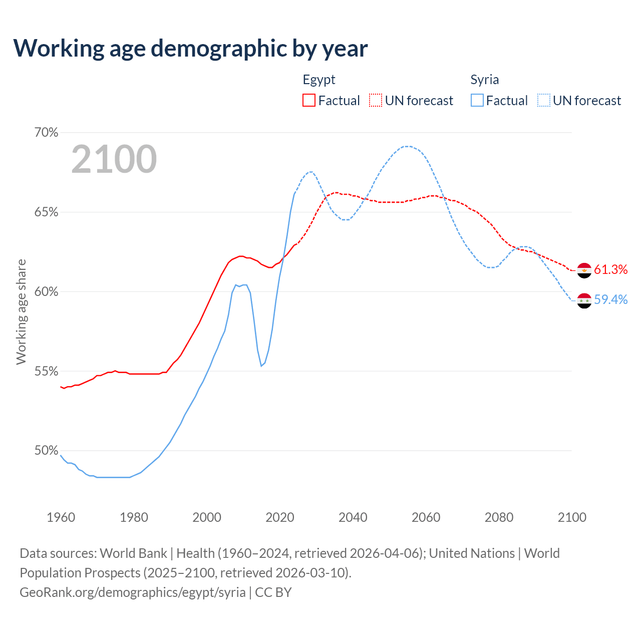 - Egypt has 75.9M working age adults (aged 15-64) vs 17.7M in Syria.