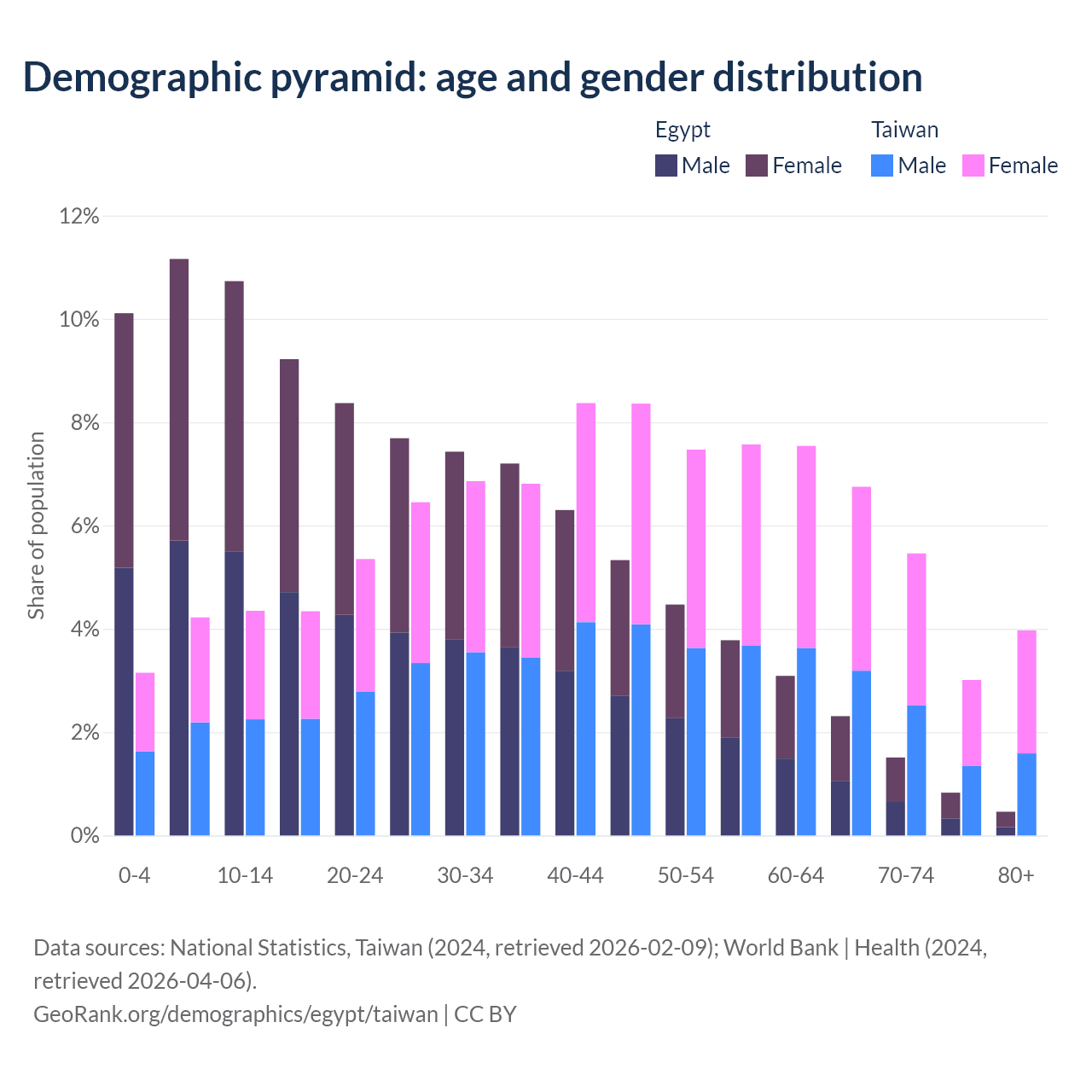 - Egypt is ranked 133/196 by median age (oldest to youngest) vs 16/196 for Taiwan.