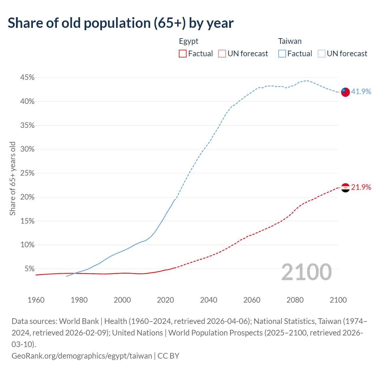 The share of older people aged 65 and over is 5.12% in Egypt and 19.2% in Taiwan. Life expectancy in Egypt compared to Taiwan .